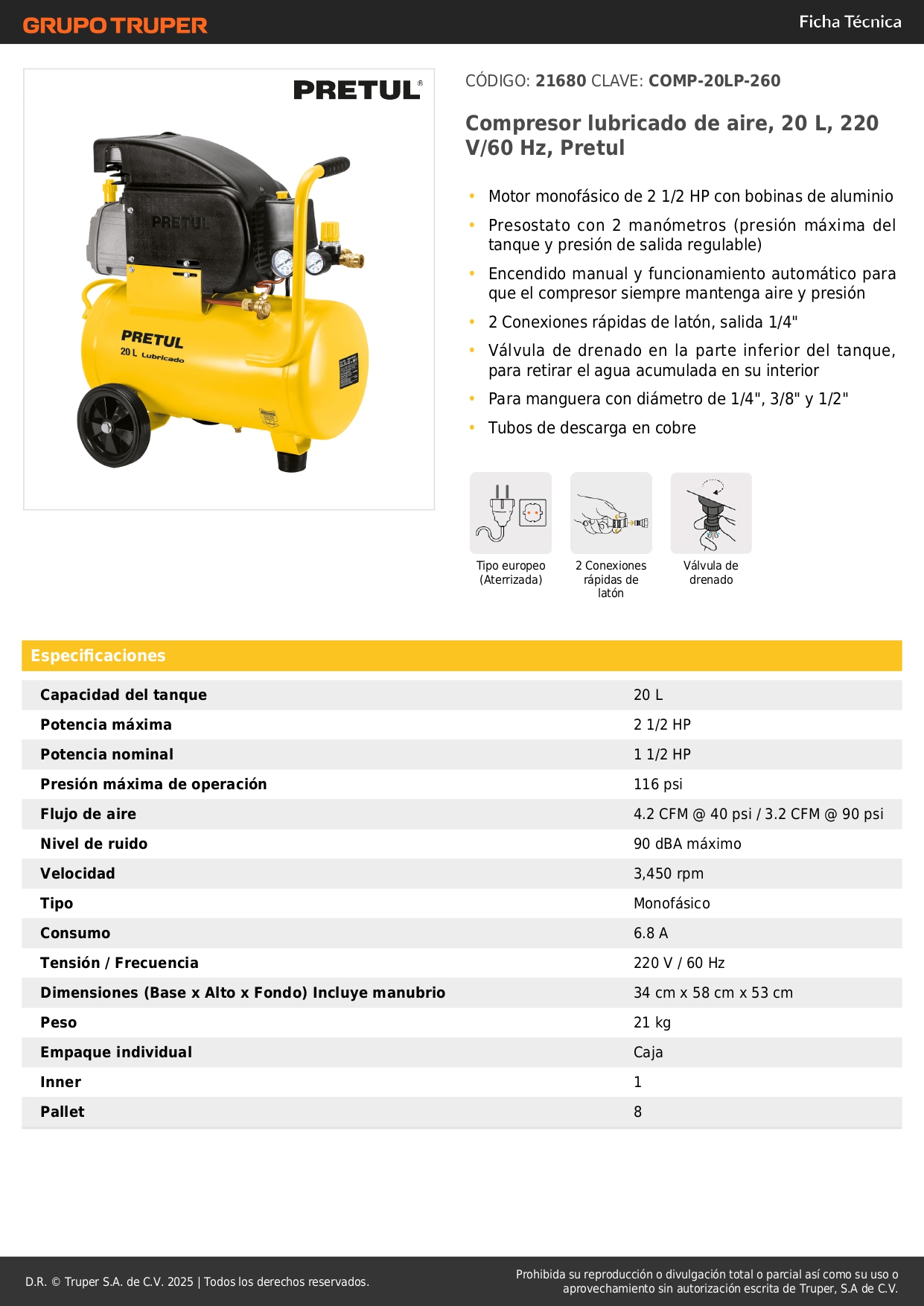 - Presión máxima de operación: 116PSI