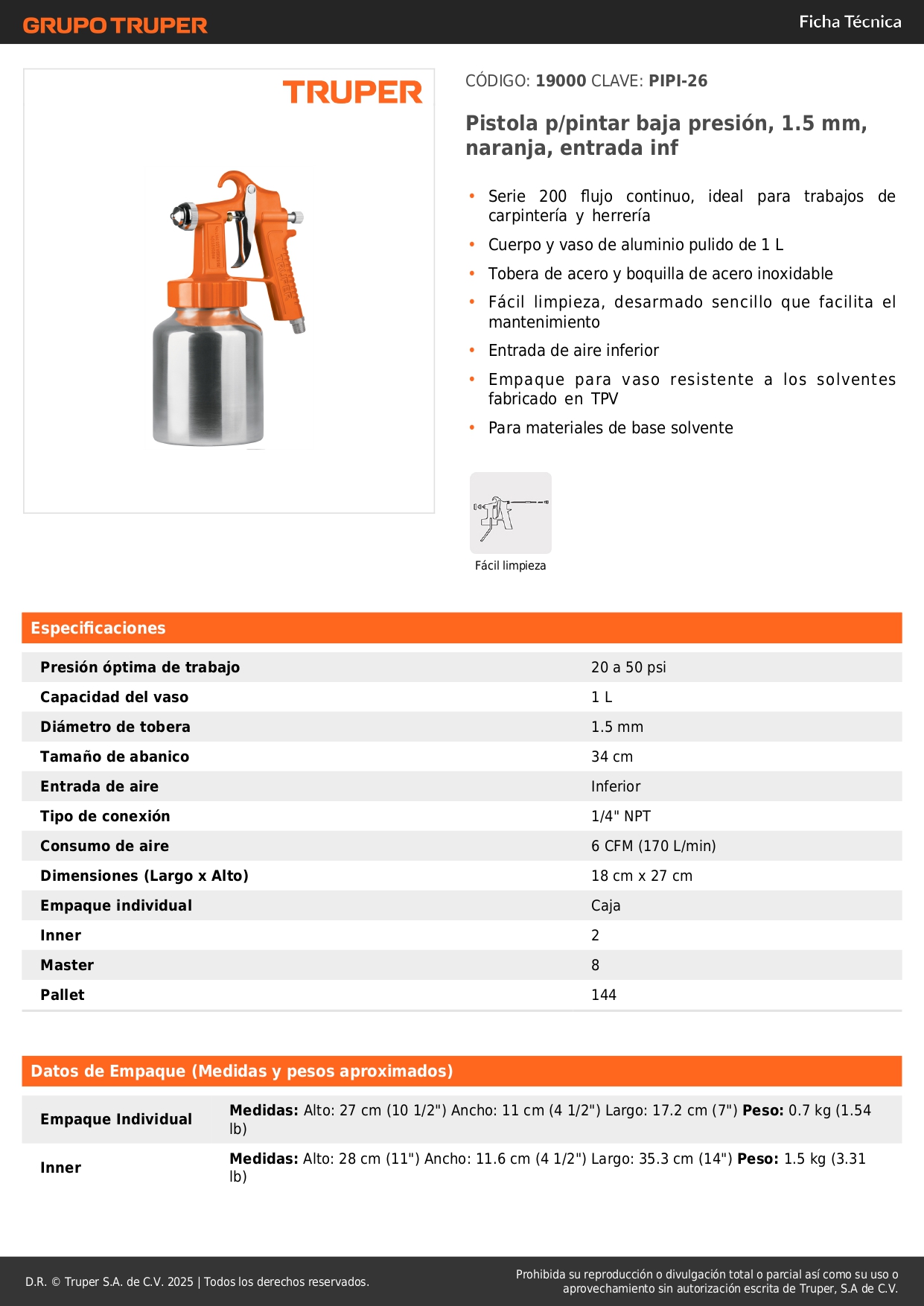 Pistola p/pintar baja presión, naranja, entrada inf, Truper