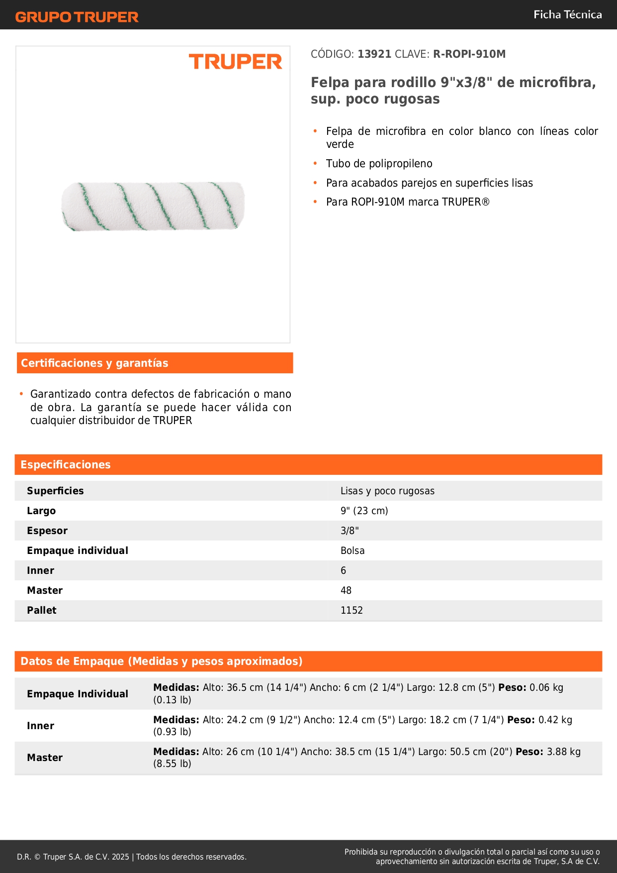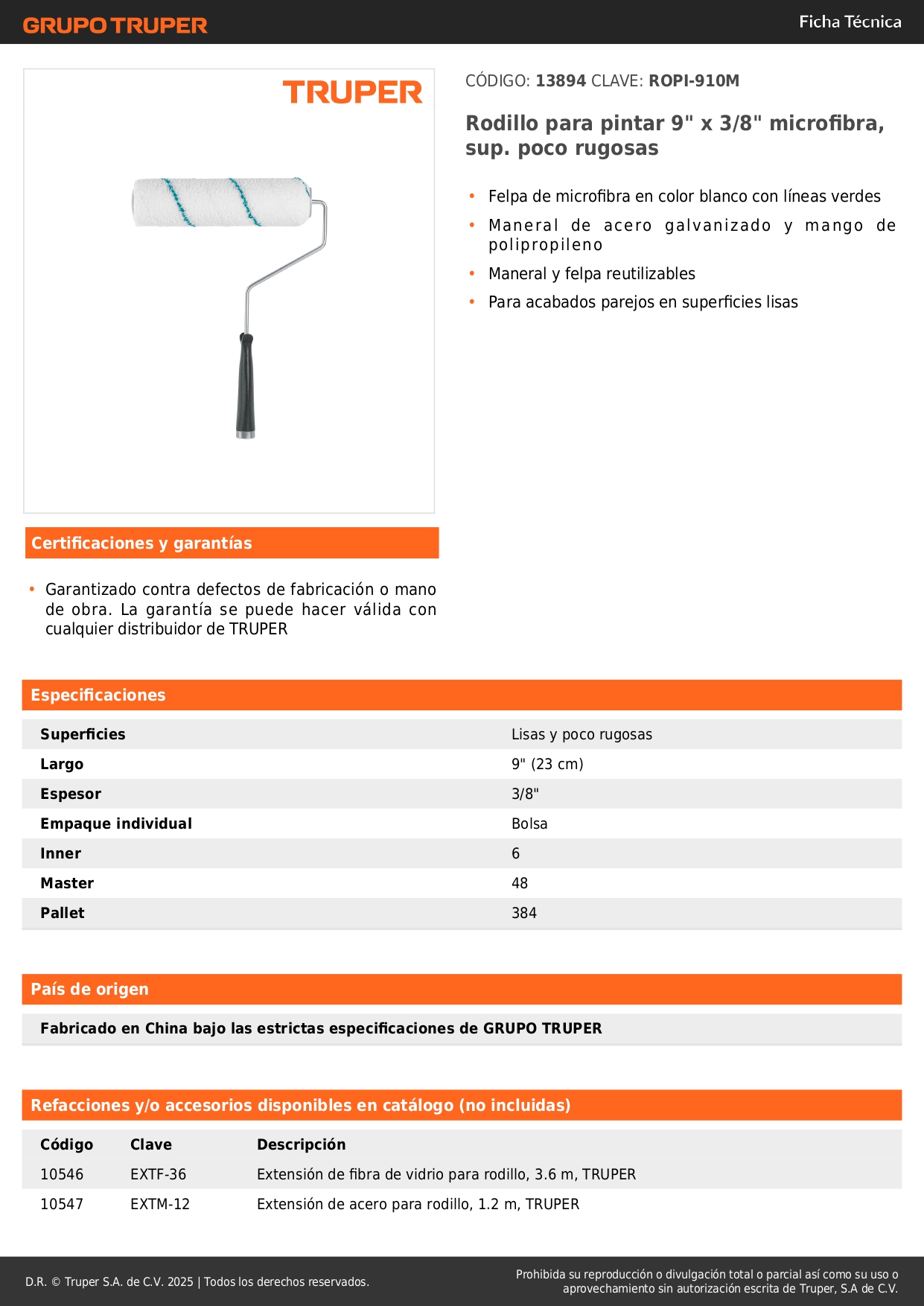 Rodillo para pintar 9" x 3/8" microfibra, sup. poco rugosas 13894