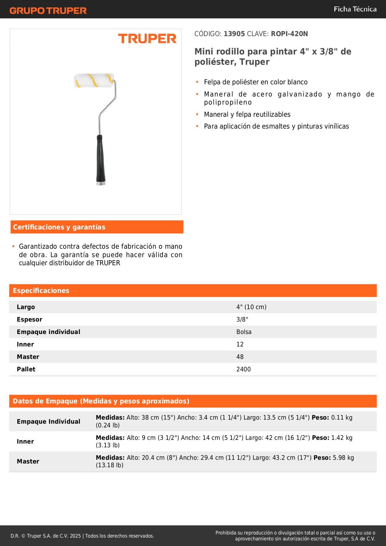 Mini rodillo para pintar 4" x 3/8" de poliéster, Truper 13905