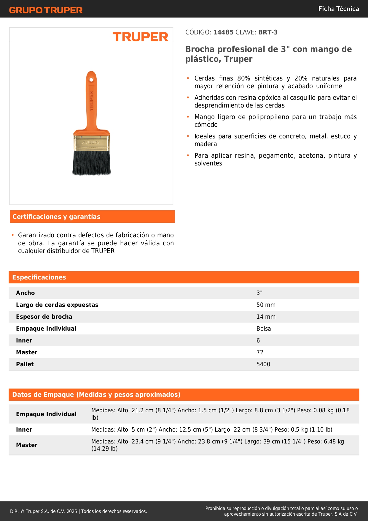 Brocha profesional de 3" con mango de plástico, Truper 14485