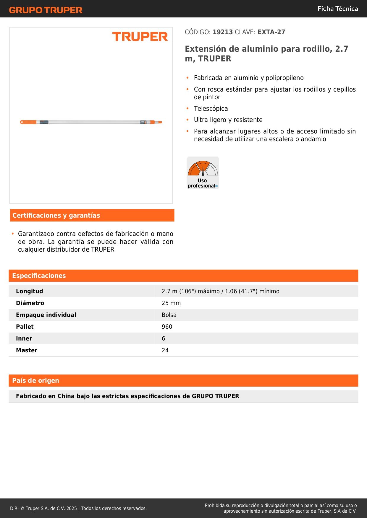 Extensión de 2.7 m de aluminio para rodillo, Truper