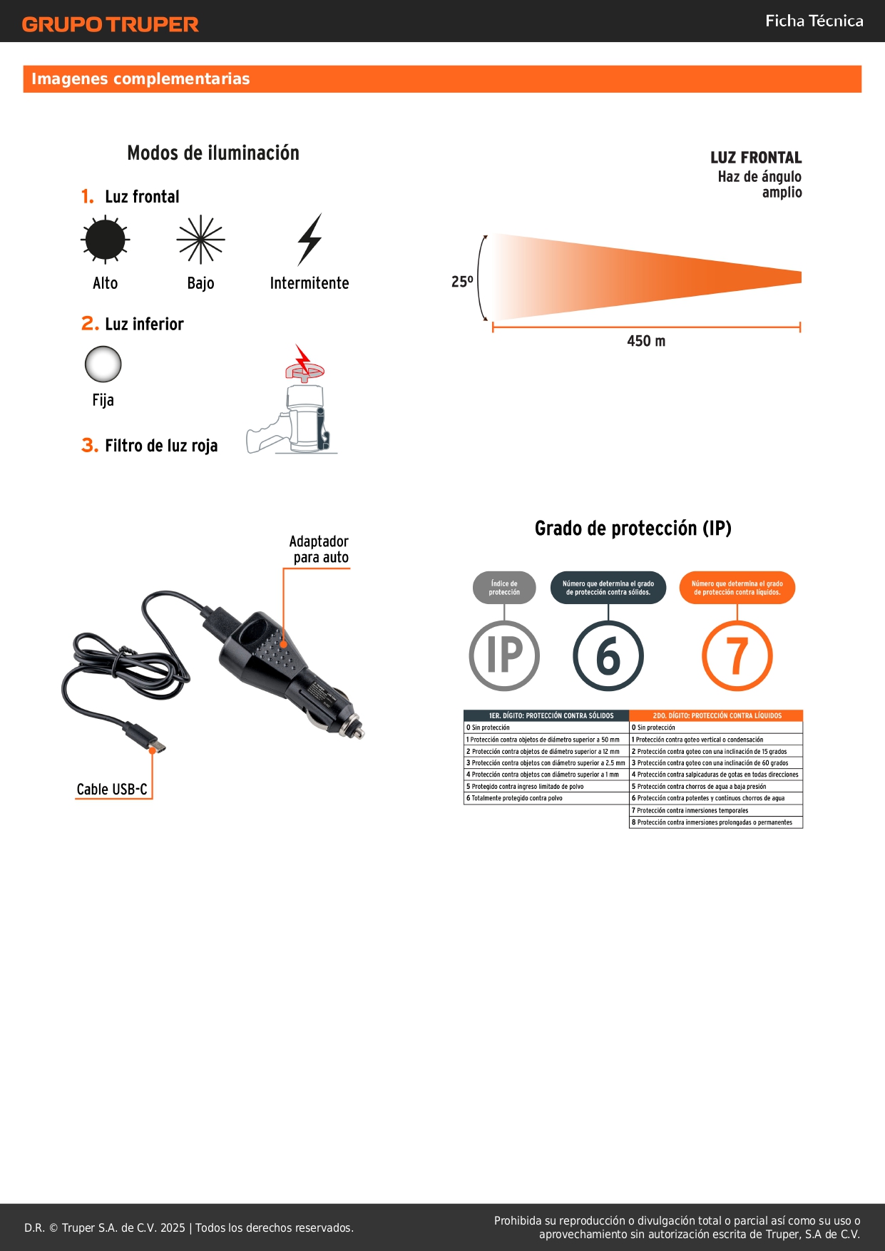 • Modos de iluminación: Frontal (alto, bajo, intermitente), luz inferior (fija) y filtro de luz roja