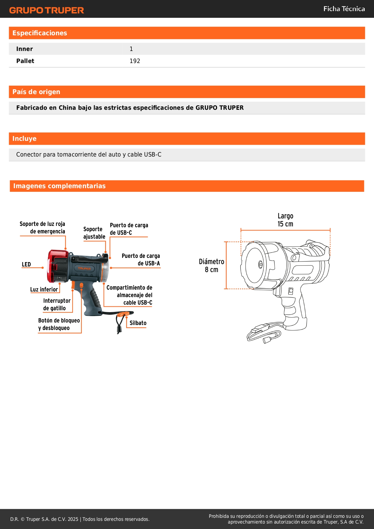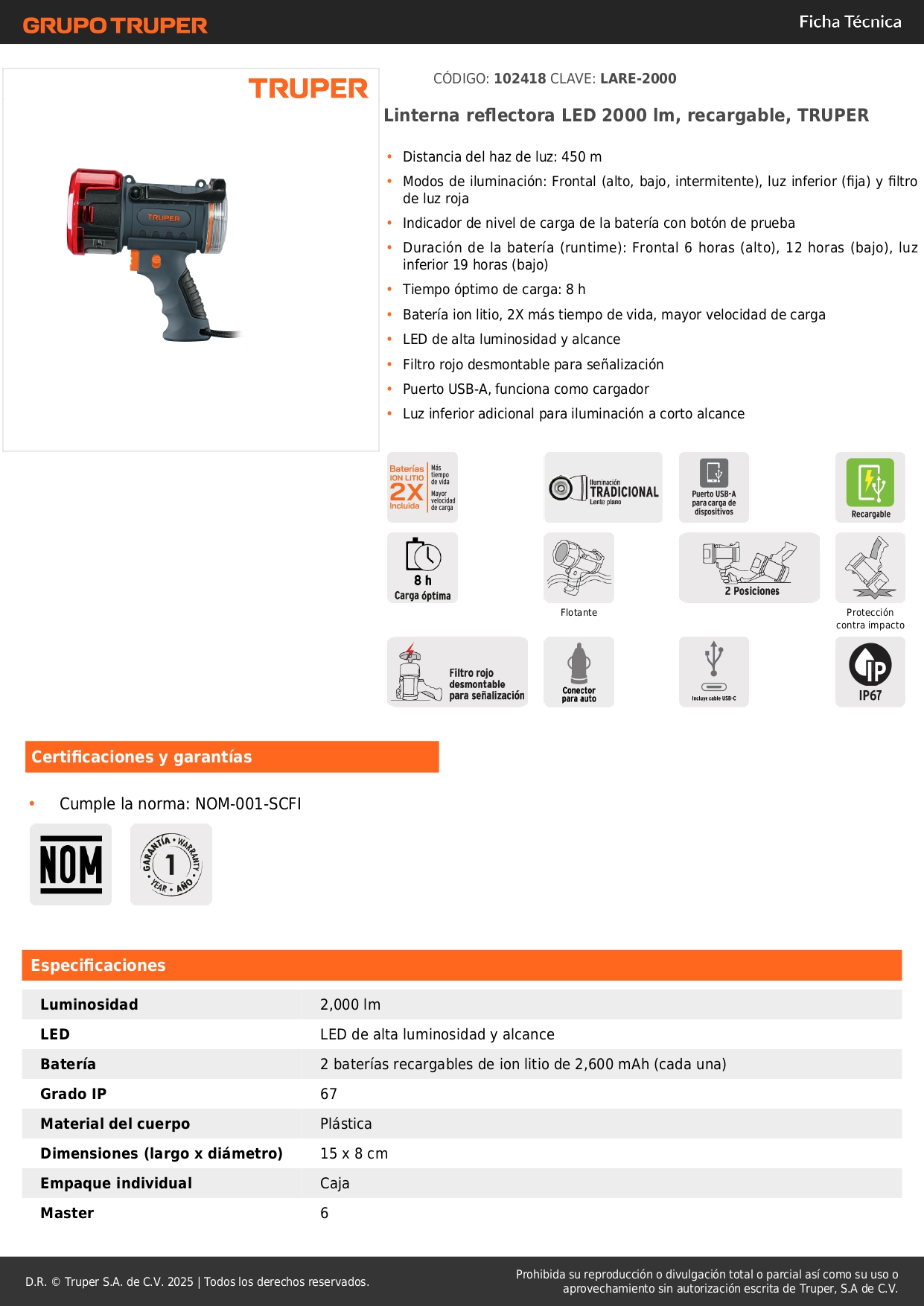 Lámpara de led 2000 lm recargable alta potencia, truper