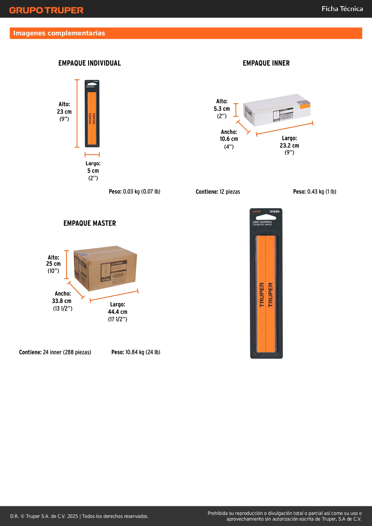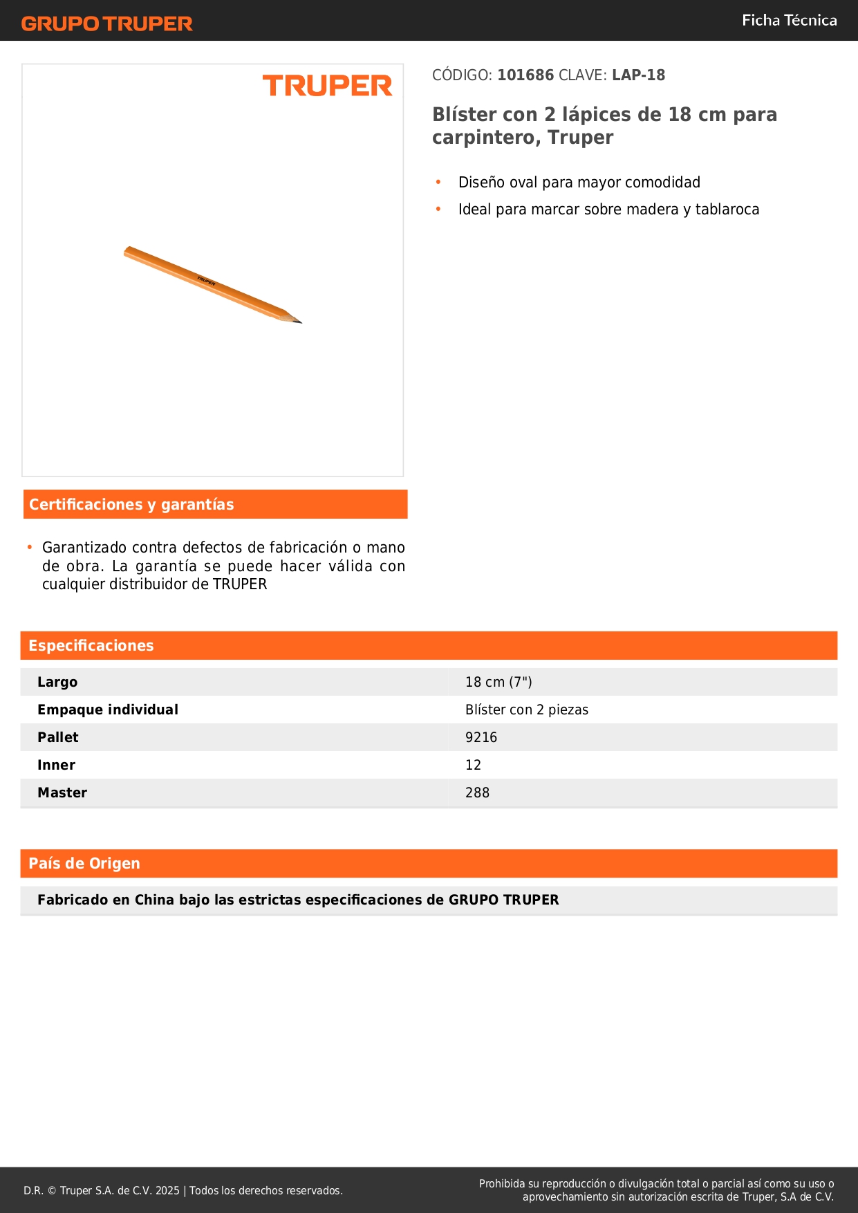 Lápiz para carpintero 18cm truper S/ 2.90 Agregar al carro Avísame cuando llegue Blíster con 2 lápices de 18 cm para carpintero, Truper• Diseño oval para mayor comodidad• Ideal para marcar sobre madera y tablarocaEspecificacionesLargo 18 cm (7")Unidad: 2