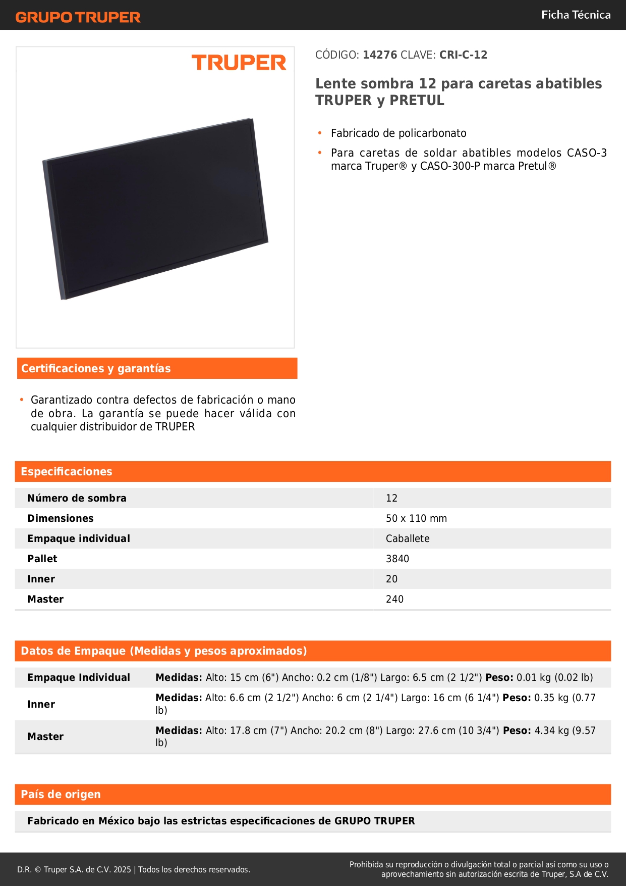 Lente sombra 12 para máscaras con lente abatible truper y pretul S/ 3.50 Agregar al carro Avísame cuando llegue -Fabricado de policarbonato-Para caretas de soldar abatibles modelos CASO-3 marca Truper® y CASO-300-P marca Pretul®