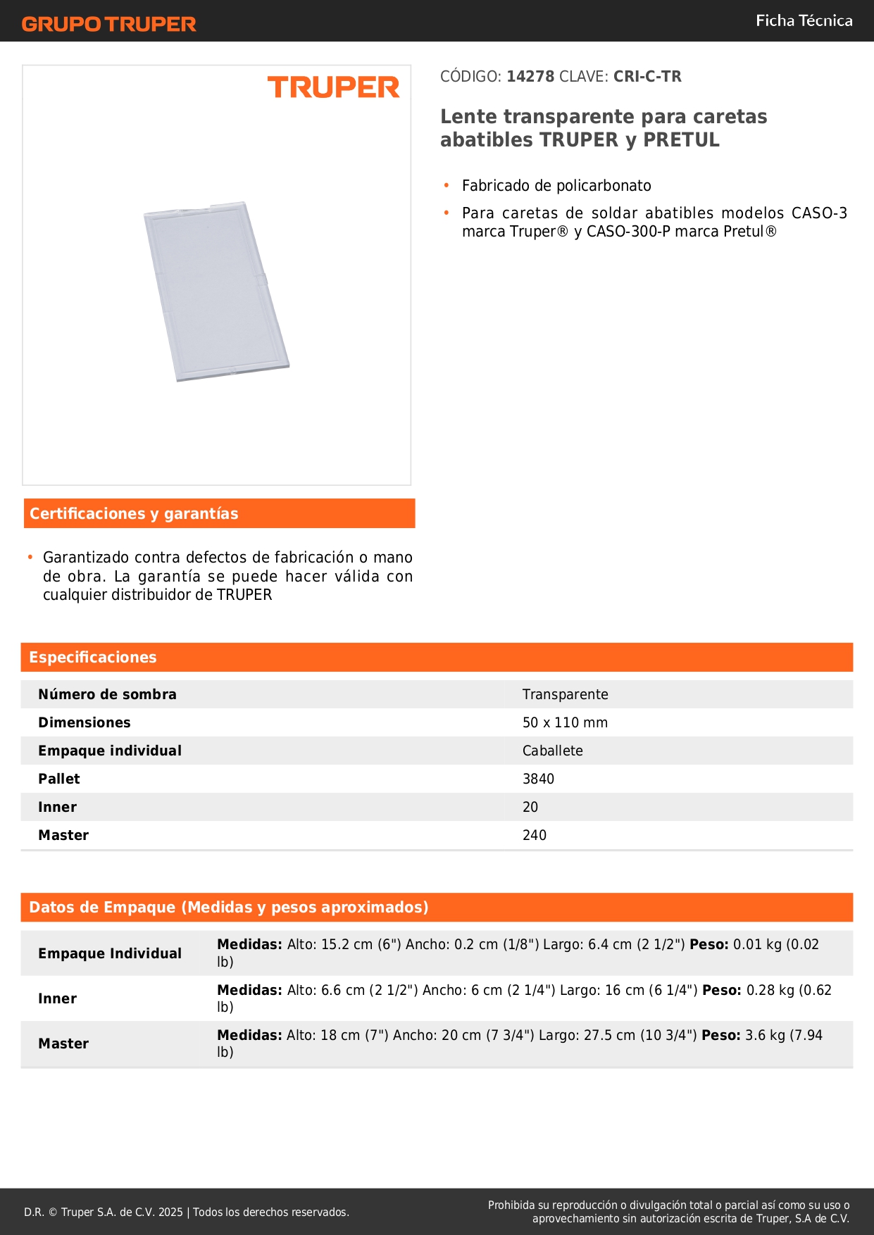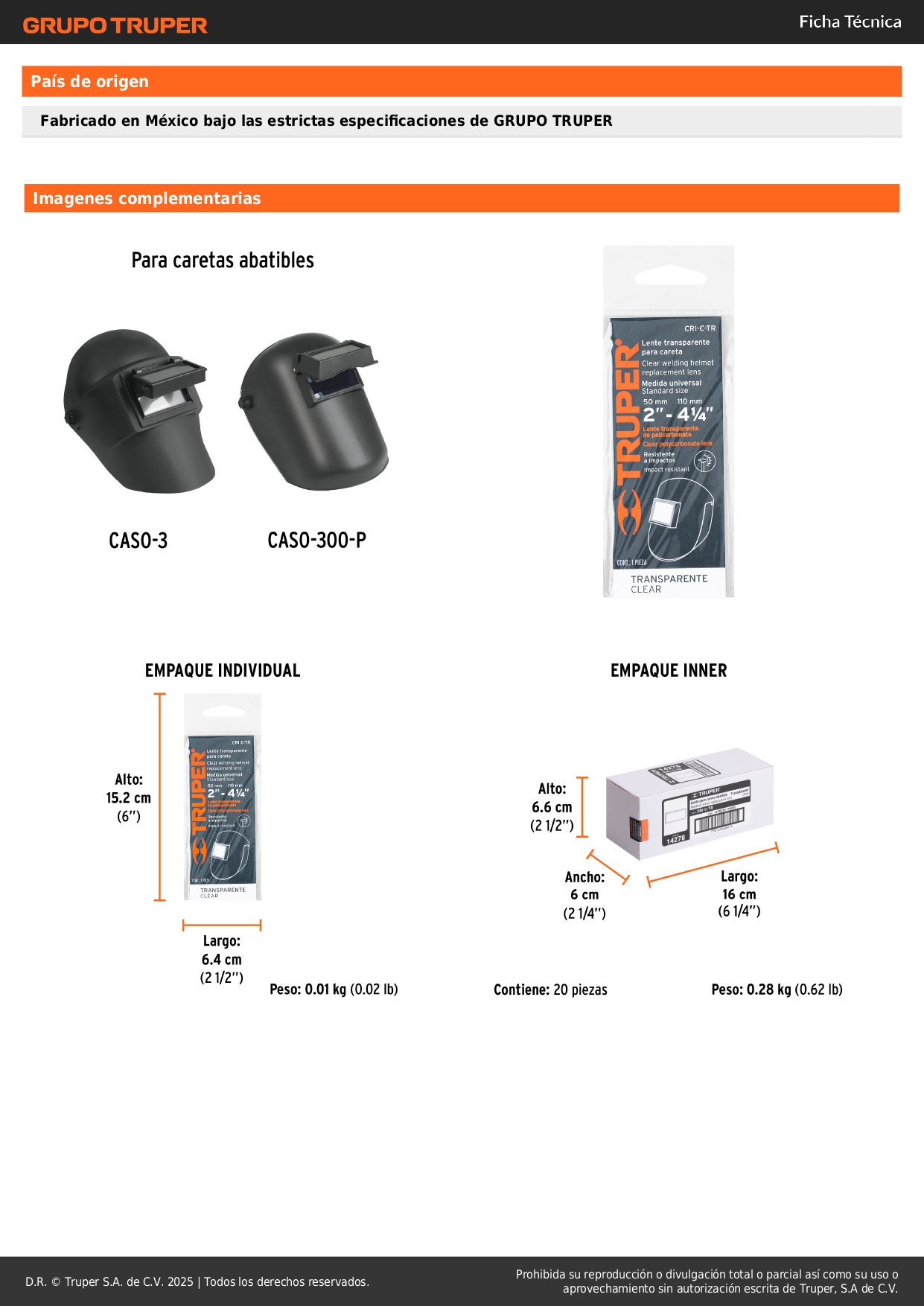 Lente transparente para máscaras con lente abatible truper y pretul S/ 3.50 Agregar al carro Avísame cuando llegue -Fabricado de policarbonato-Para caretas de soldar abatibles modelos CASO-3 marca Truper® y CASO-300-P marca Pretul®