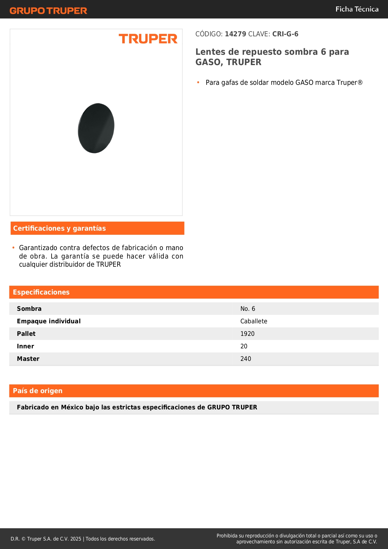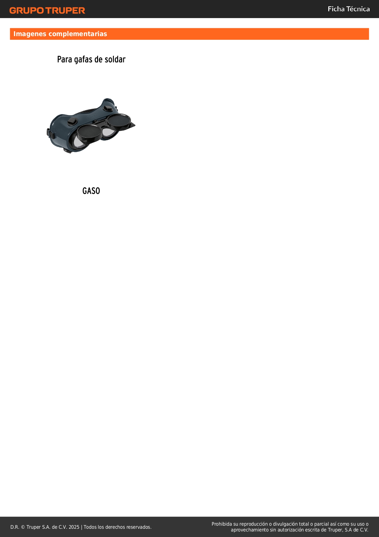 Lentes de repuesto sombra 6 para gaso, truper S/ 3.30 Agregar al carro Avísame cuando llegue -Para gafas de soldar modelo GASO marca Truper®