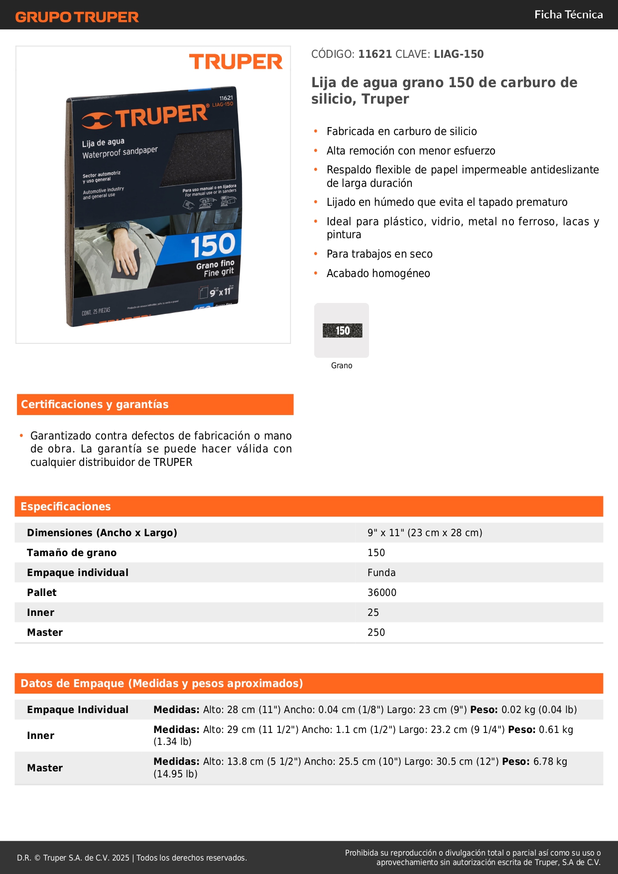 Lija de agua grano 150 de carburo de silicio, por unidad, truper