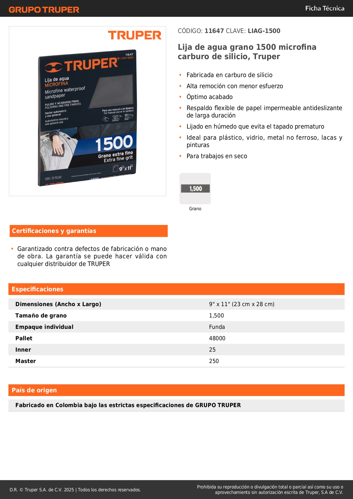 Lija de agua grano 1500 microfina carburo de silicio, por unidad, truper