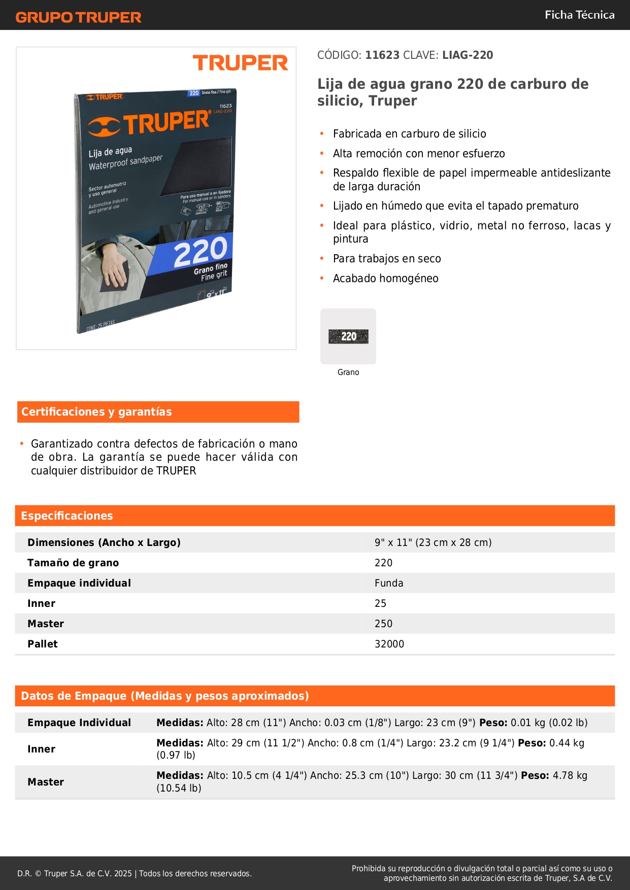 Lija de agua grano 220 de carburo de silicio, por unidad, truper
