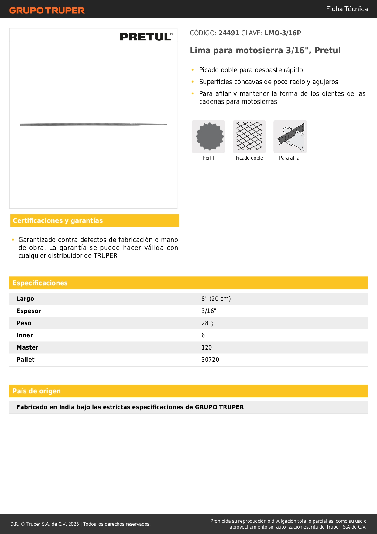 Lima para motosierra 3/16´´, pretul S/ 3.70 Agregar al carro Avísame cuando llegue -Picado doble para desbaste rápido-Superficies cóncavas de poco radio y agujeros-Para afilar y mantener la forma de los dientes de las cadenas para motosierras