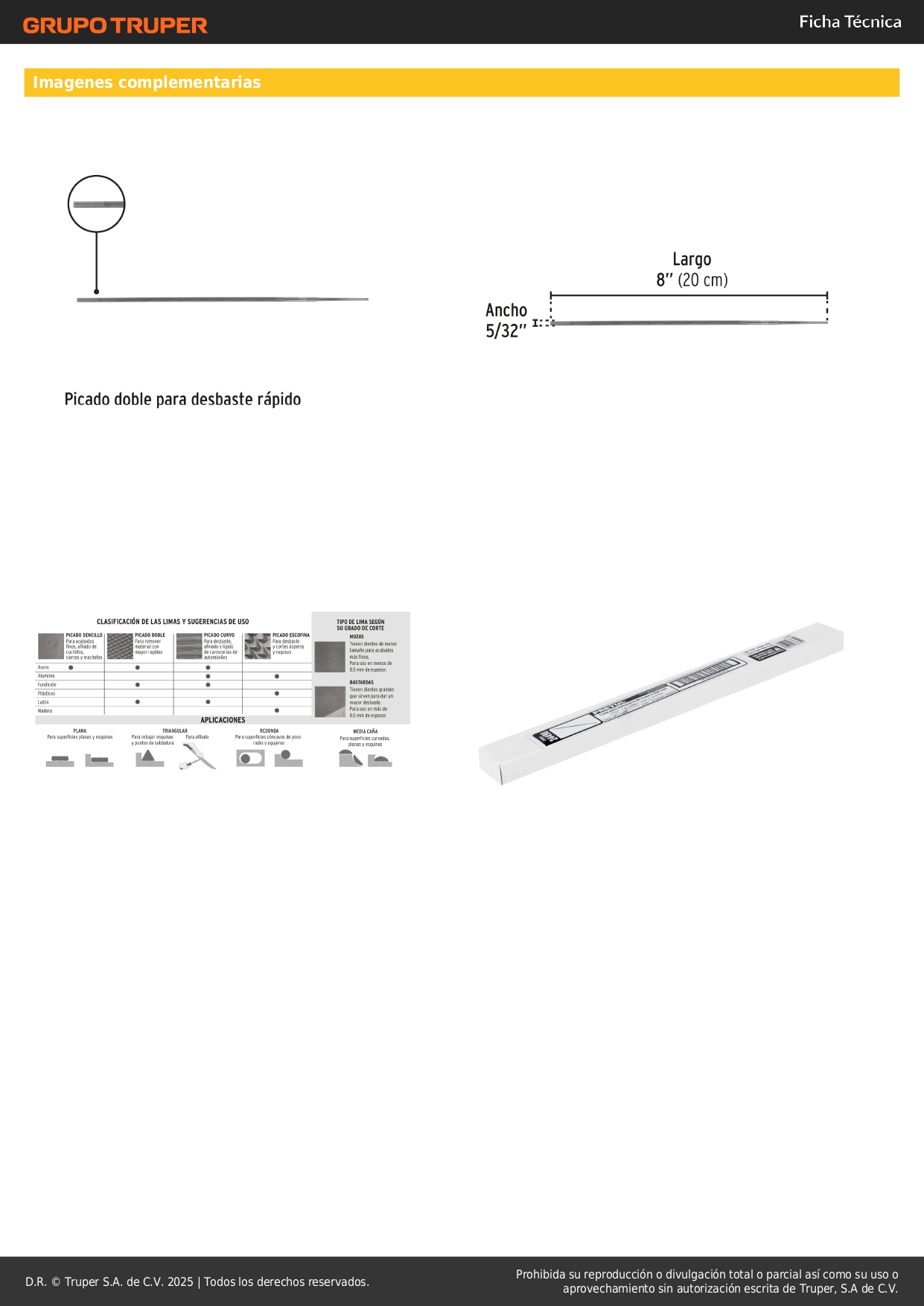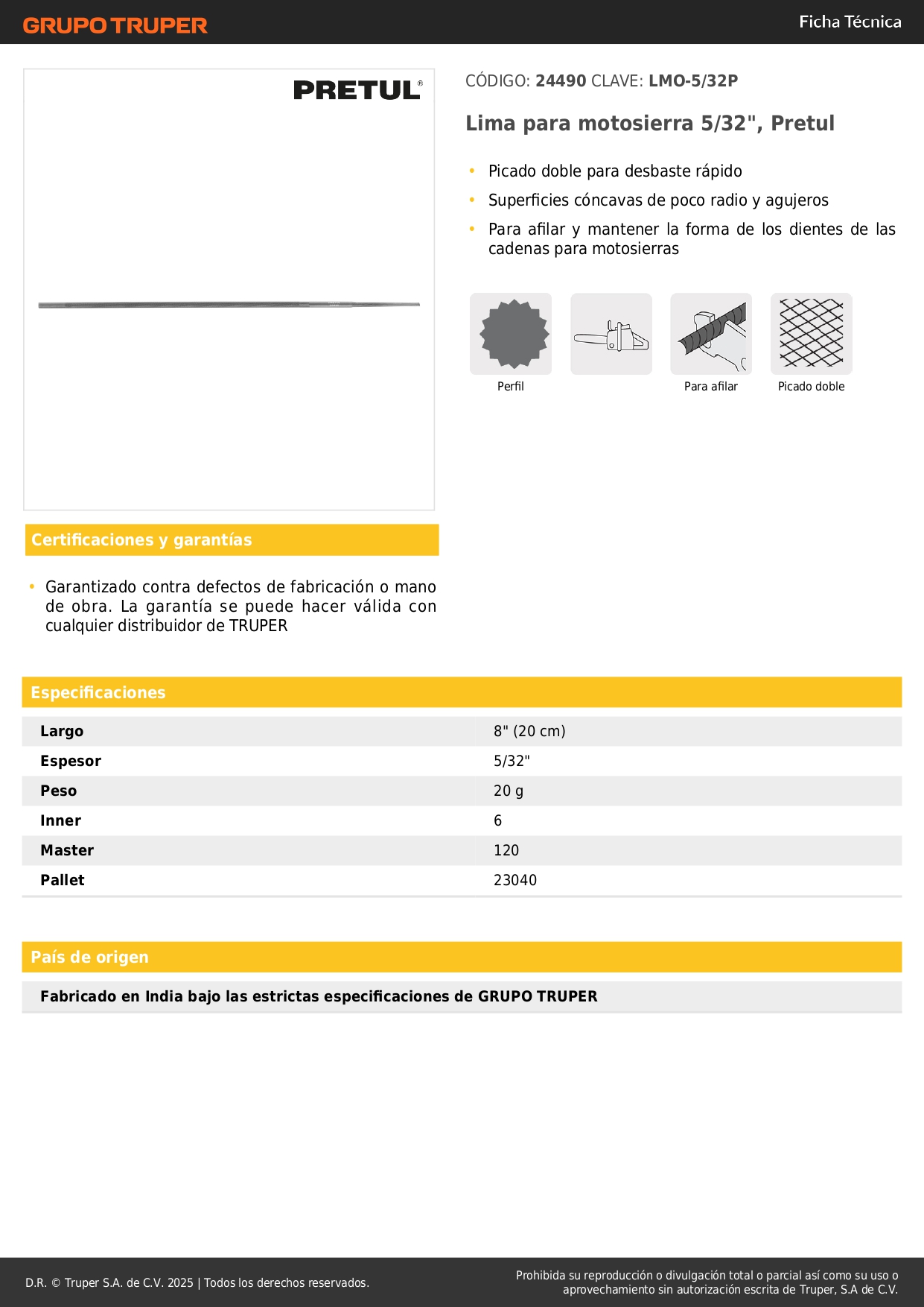 Lima para motosierra 5/32´´, pretul S/ 3.70 Agregar al carro Avísame cuando llegue -Picado doble para desbaste rápido-Superficies cóncavas de poco radio y agujeros-Para afilar y mantener la forma de los dientes de las cadenas para motosierras