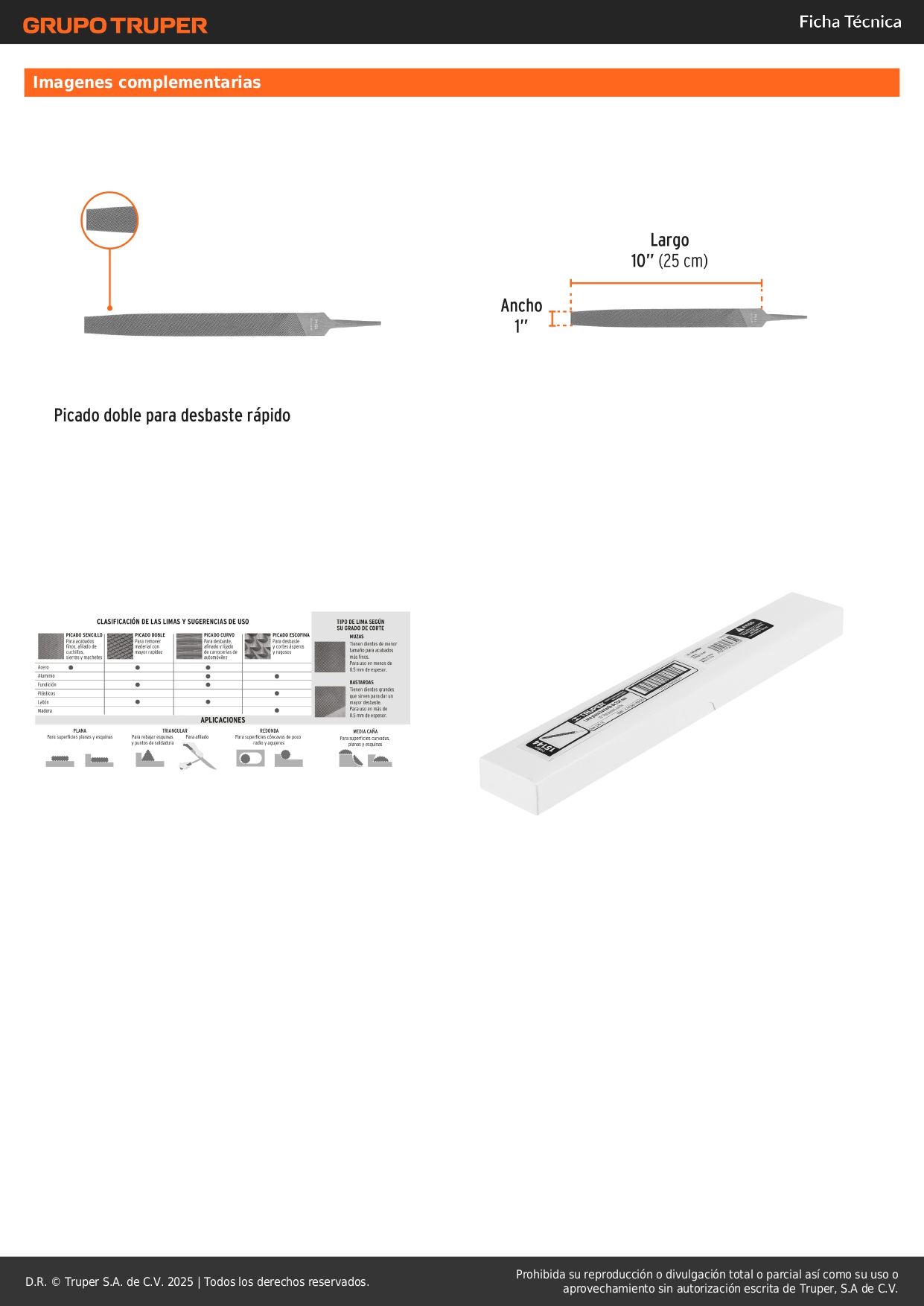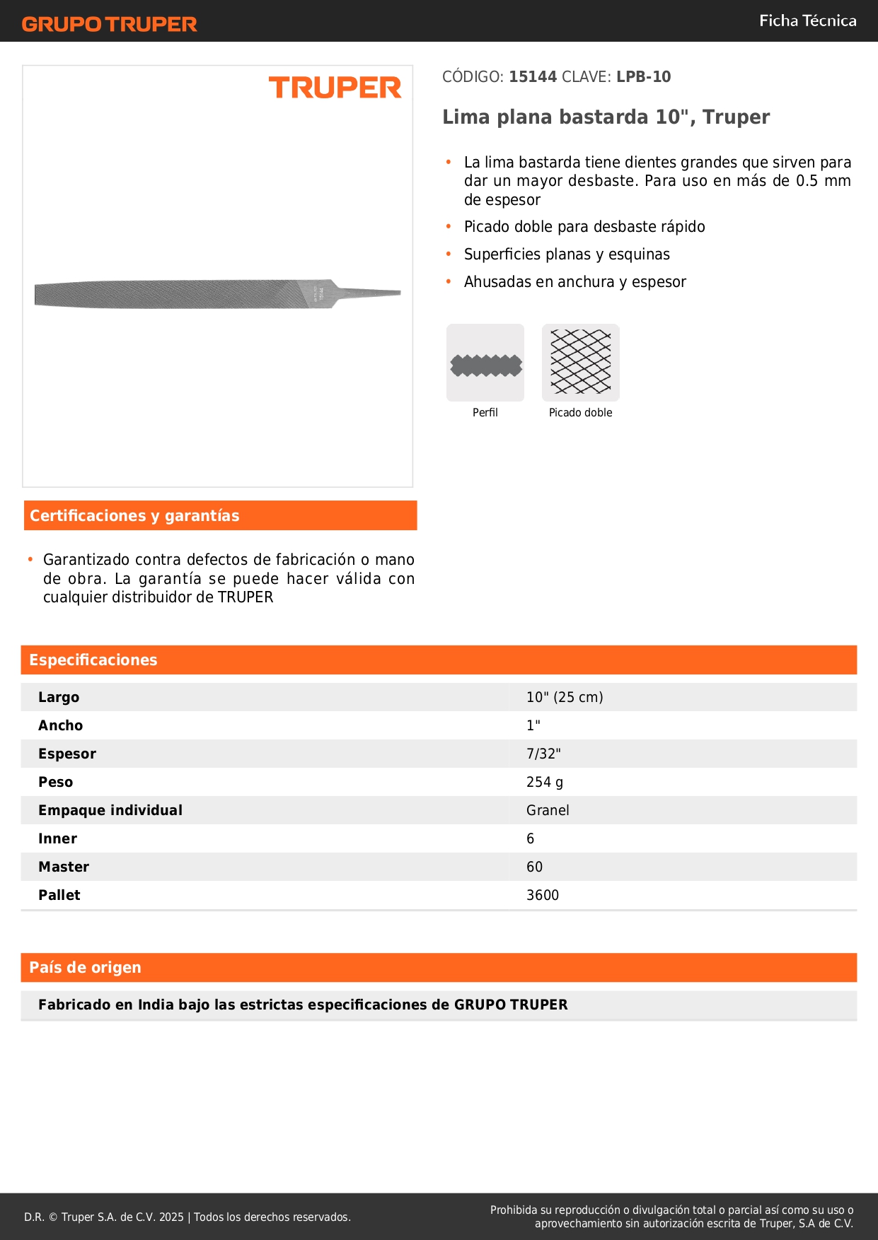 Lima plana bastarda 10´´, truper S/ 13.40 Agregar al carro Avísame cuando llegue -La lima bastarda tiene dientes grandes que sirven para dar un mayor desbaste. Para uso en más de 0.5 mm de espesor-Picado doble para desbaste rápido-Superficies planas y esquinas-Ahusadas en anchura y espesor