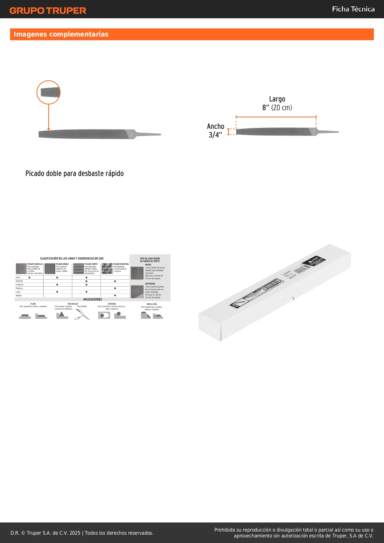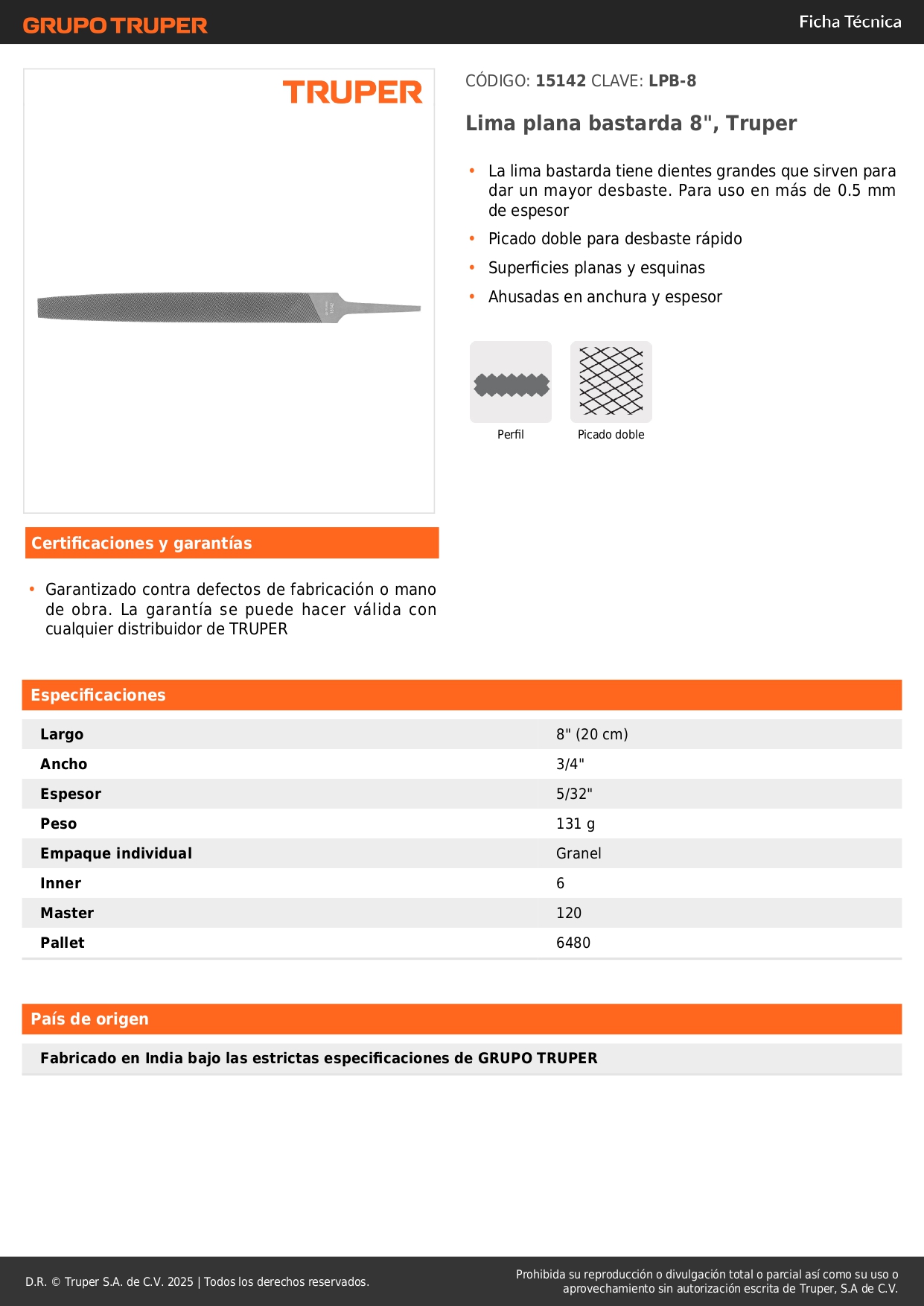 Lima plana bastarda 8´´, truper S/ 7.90 Agregar al carro Avísame cuando llegue -La lima bastarda tiene dientes grandes que sirven para dar un mayor desbaste. Para uso en más de 0.5 mm de espesor-Picado doble para desbaste rápido-Superficies planas y esquinas-Ahusadas en anchura y espesor