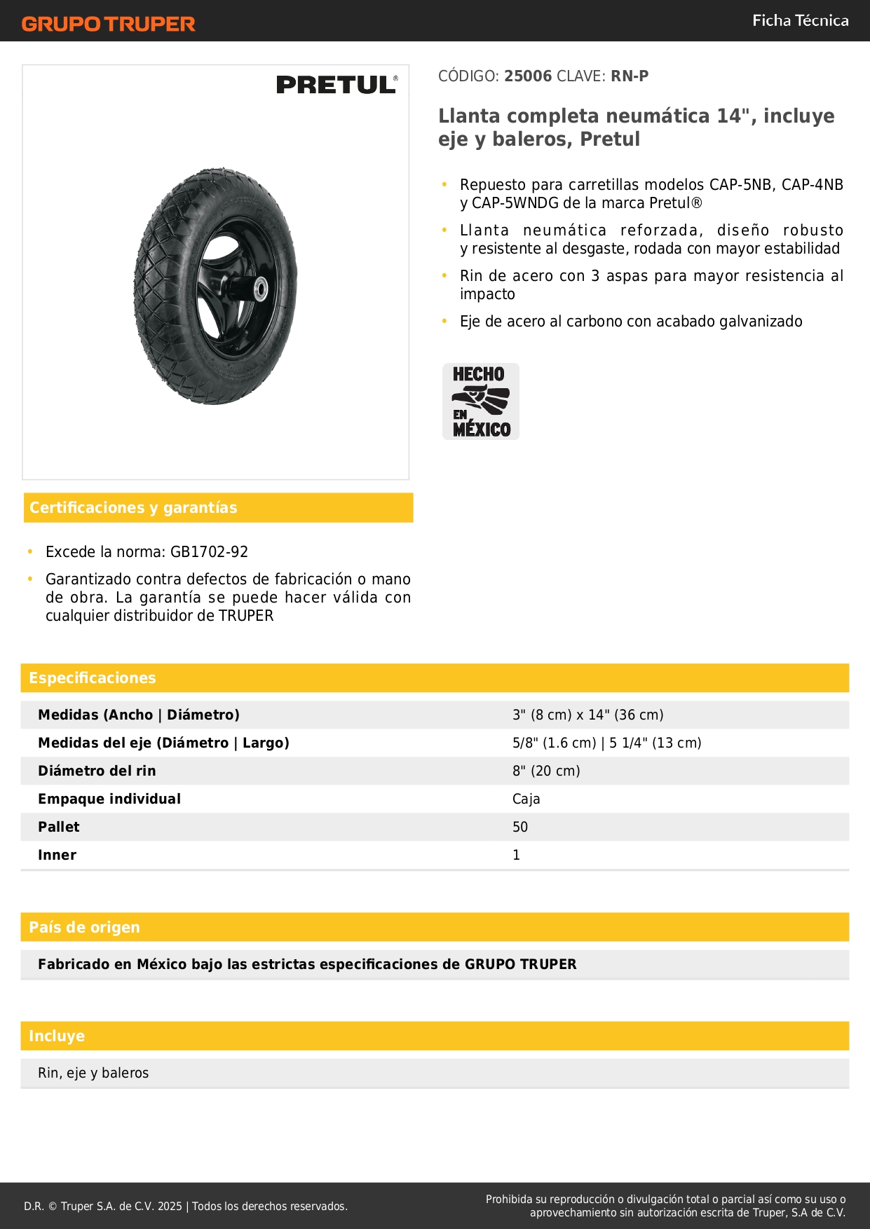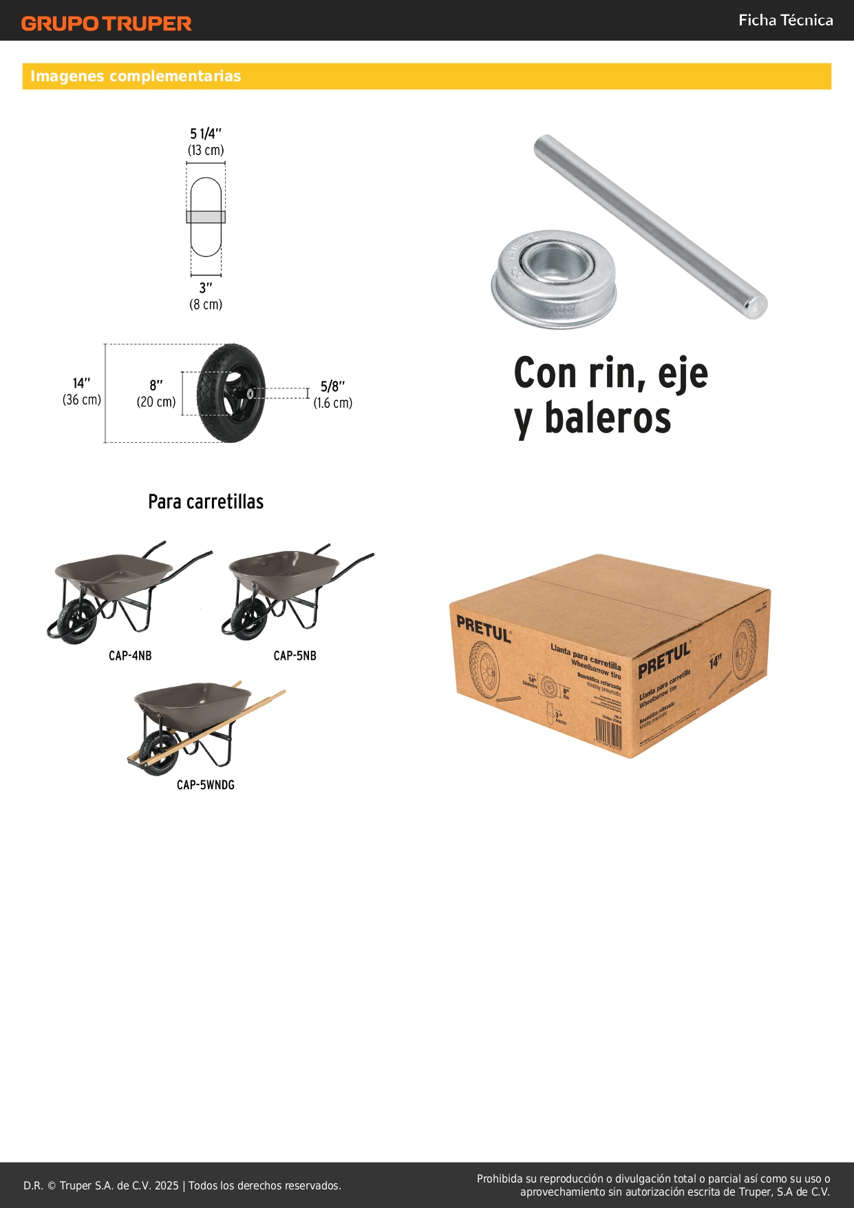 Llanta completa neumática 14''. incluye eje y baleros. pretul