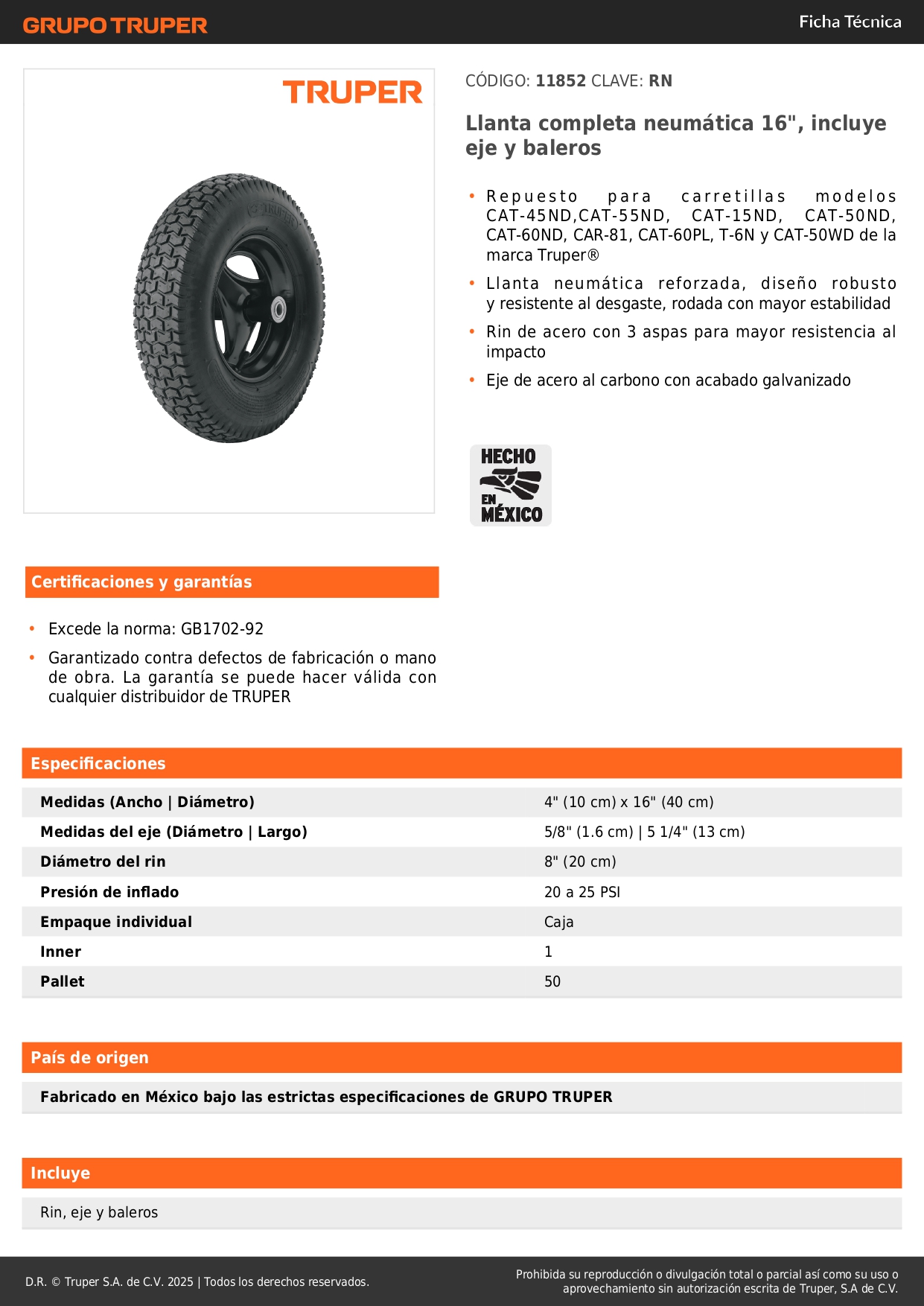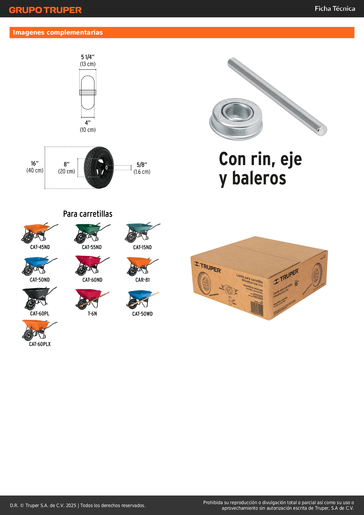 -Repuesto para carretillas modelos CAT-45ND,CAT-55ND, CAT-15ND, CAT-50ND, CAT-60ND, CAR-81, CAT-60PL, T-6N y CAT-50WD de la marca Truper®
