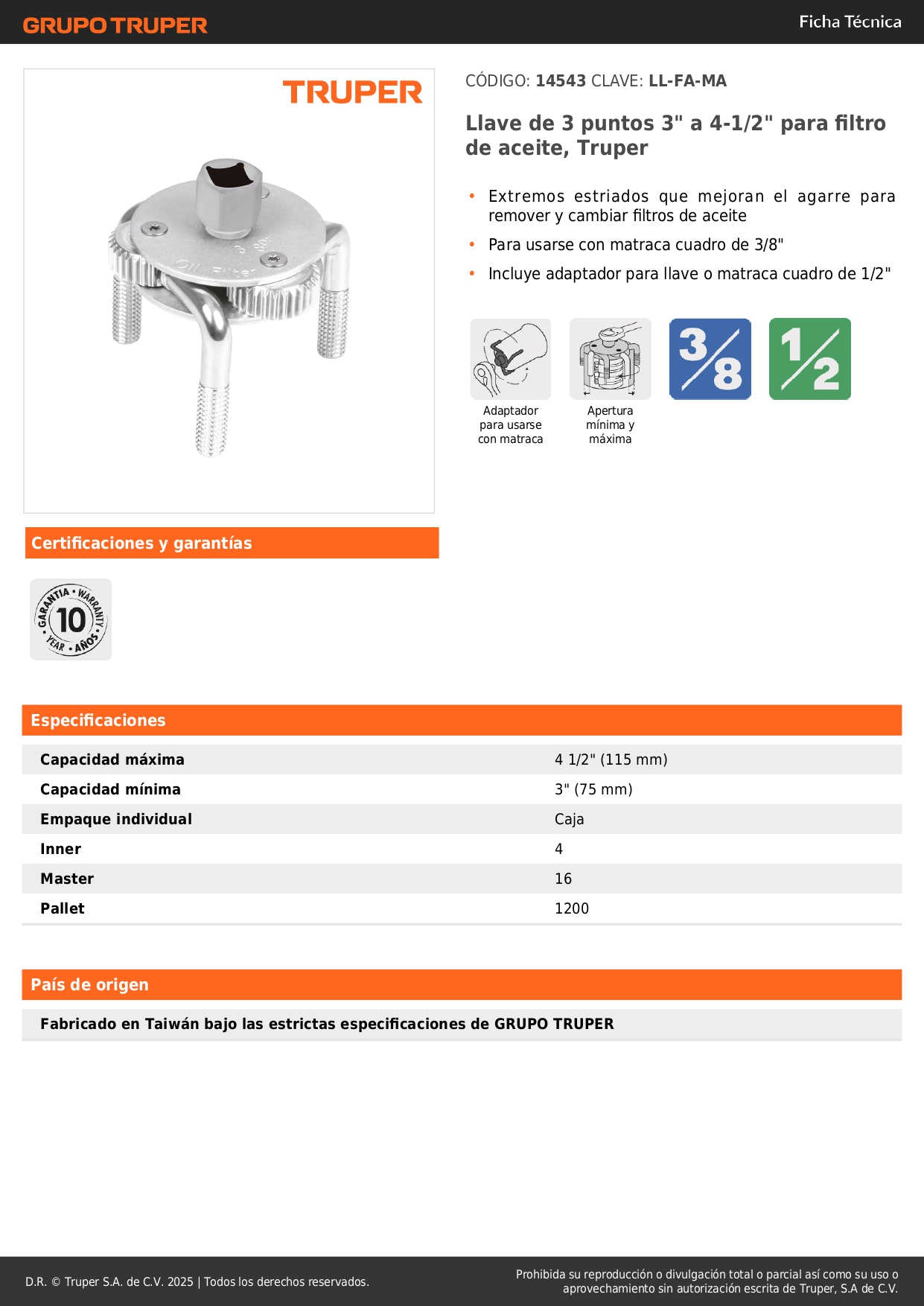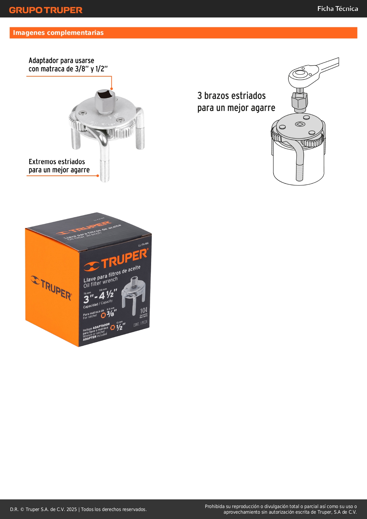 Llave de 3 puntos 3''-4-1/2'' para filtro de aceite truper S/ 76.40 Agregar al carro Avísame cuando llegue -Extremos estriados que mejoran el agarre para remover y cambiar filtros de aceite-Para usarse con matraca cuadro de 3/8"-Incluye adaptador para llave o matraca cuadro de 1/2"