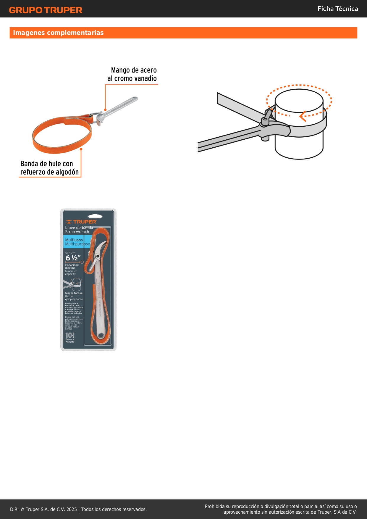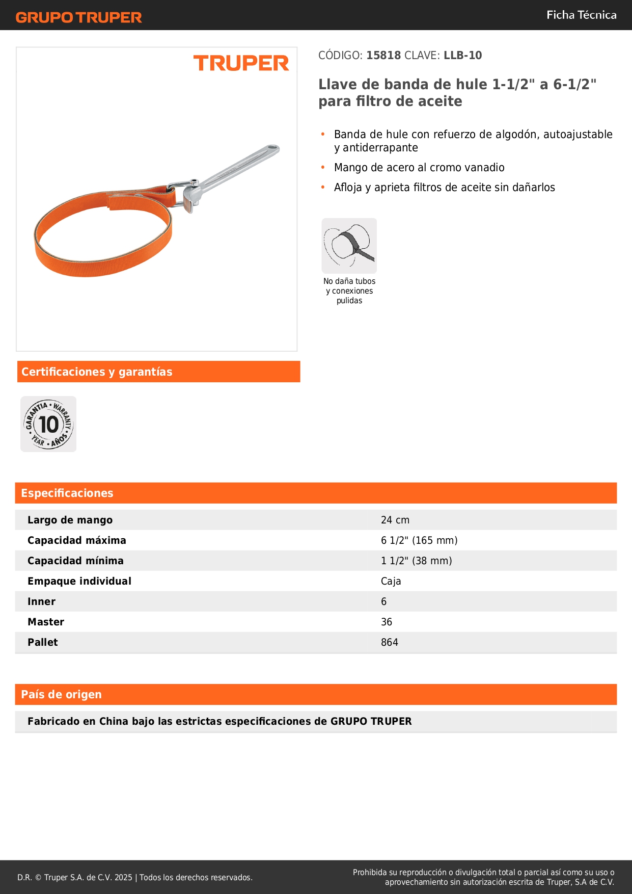 Llave de banda de hule 1-1/2''-6-1/2'' para filtro de aceite truper S/ 52.00 Agregar al carro Avísame cuando llegue -Banda de hule con refuerzo de algodón, autoajustable y antiderrapante-Mango de acero al cromo vanadio-Afloja y aprieta filtros de aceite sin dañarlos
