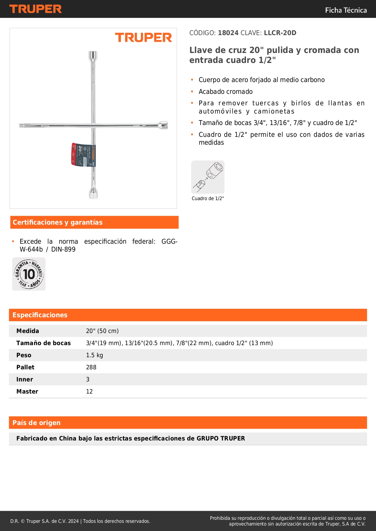 Llave de cruz 20'' pulida y cromada con entrada cuadro 1/2'' truper