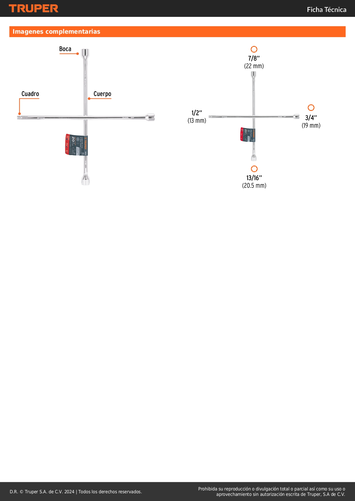 -Tamaño de bocas 3/4", 13/16", 7/8" y cuadro de 1/2"