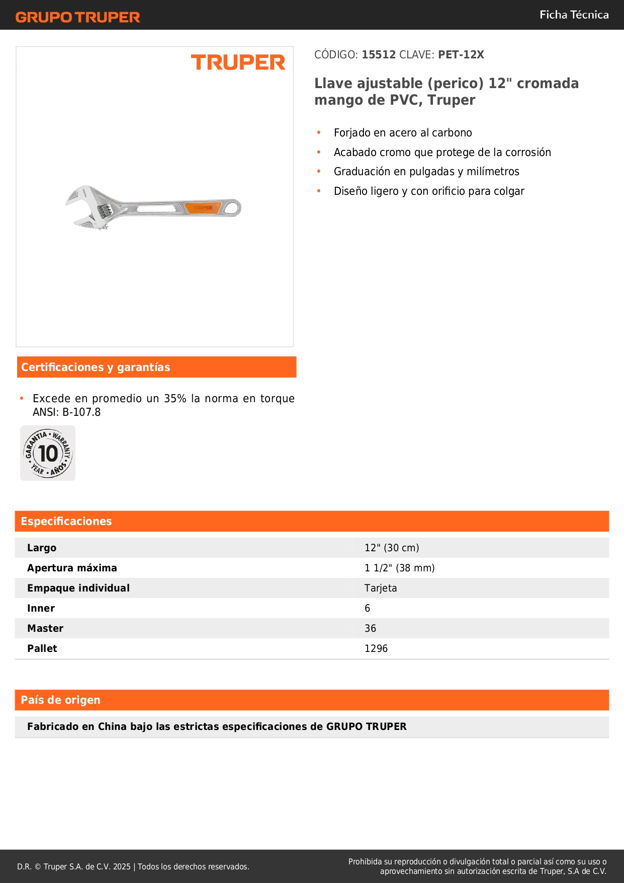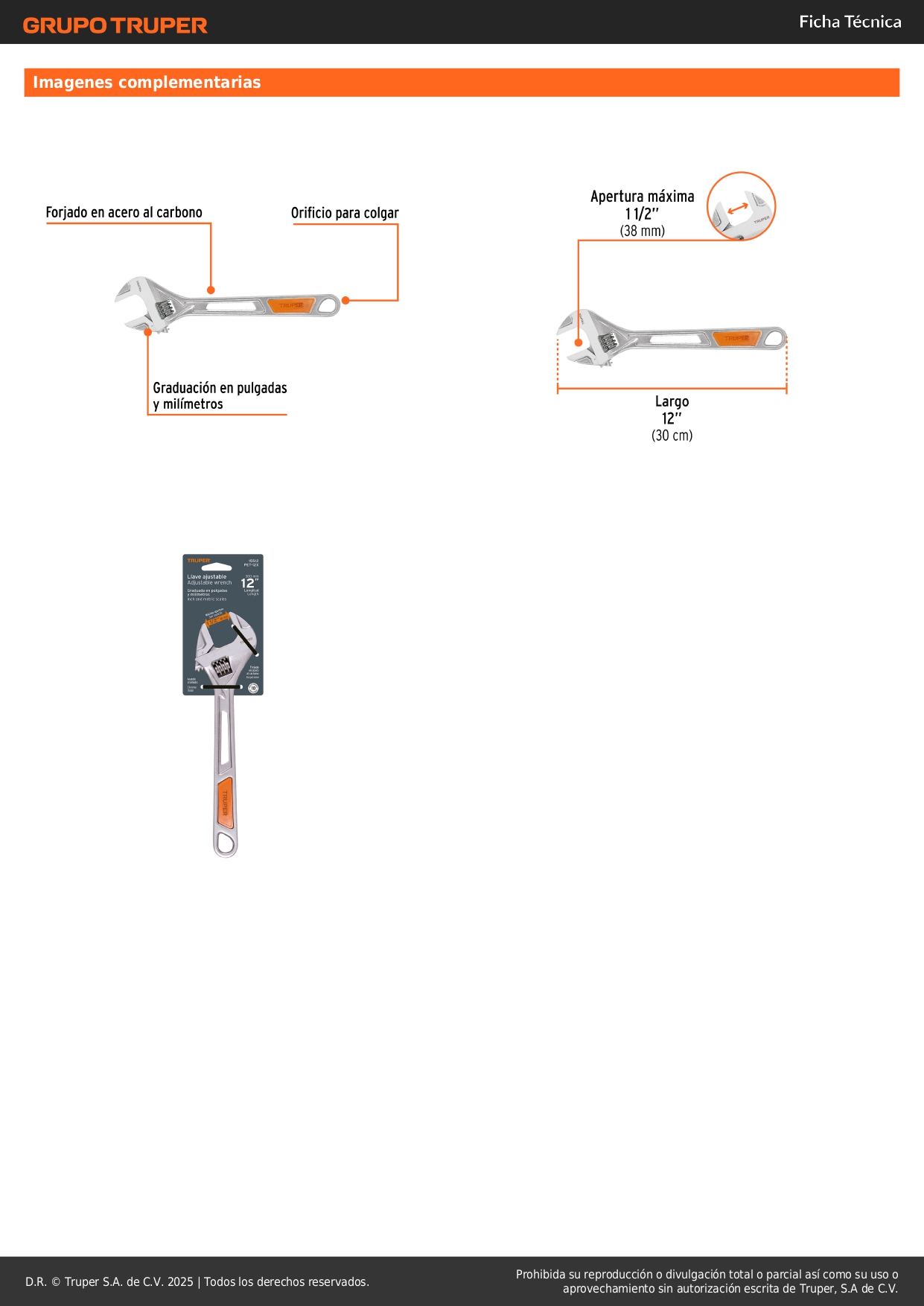 Llave francesa 12'' cromada mango de pvc truper S/ 35.90 Agregar al carro Avísame cuando llegue -Forjado en acero al carbono-Acabado cromo que protege de la corrosión-Graduación en pulgadas y milímetros-Diseño ligero y con orificio para colgar