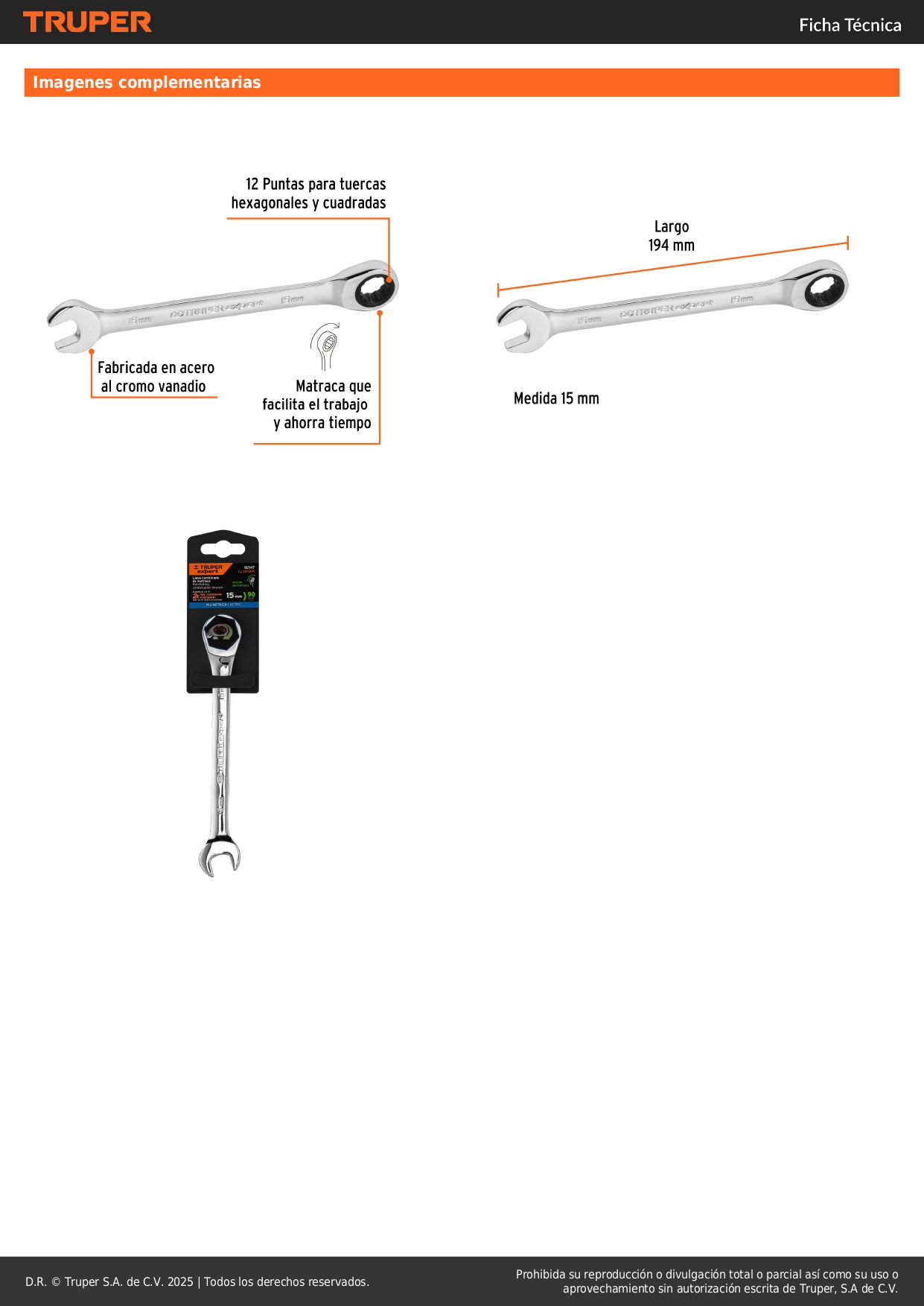 Llave mixta con ratchet 15 mm x 194 mm largo expert truper
