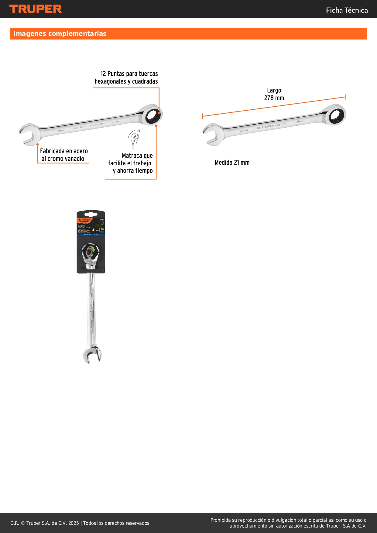 Llave mixta con ratchet 21 mm x 278 mm largo truper