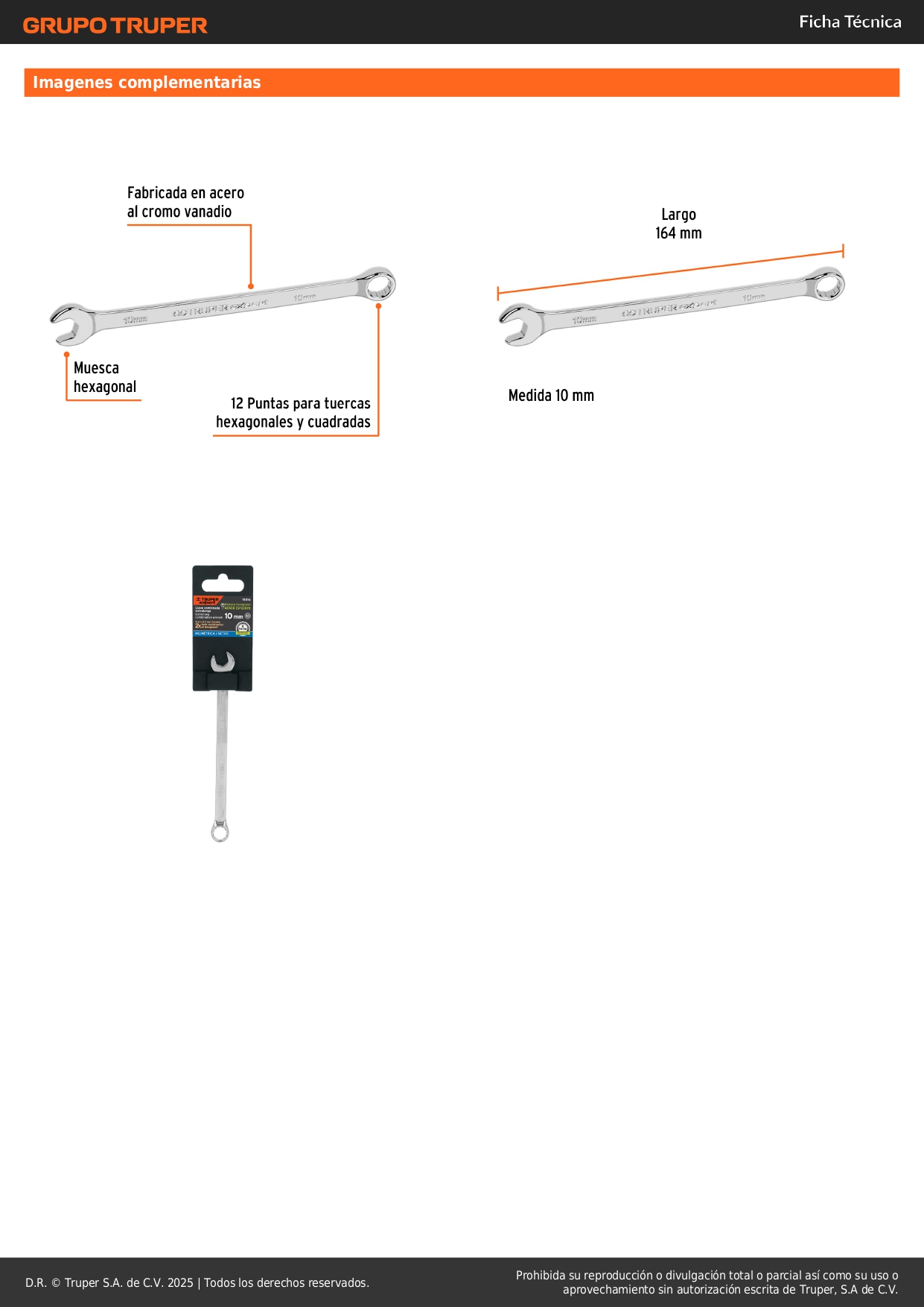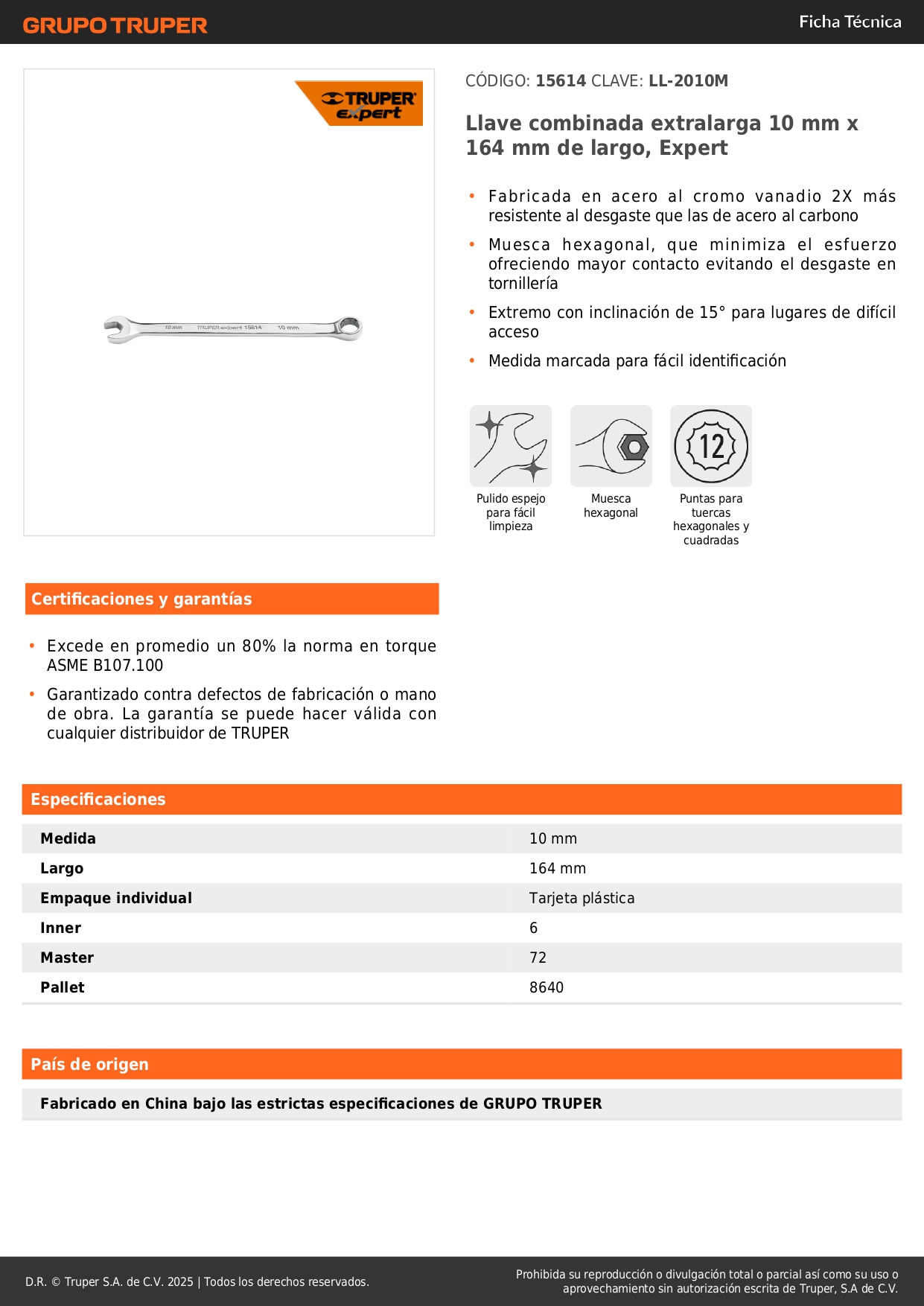 Llave mixta extralarga 10 mm x 164 mm de largo expert truper