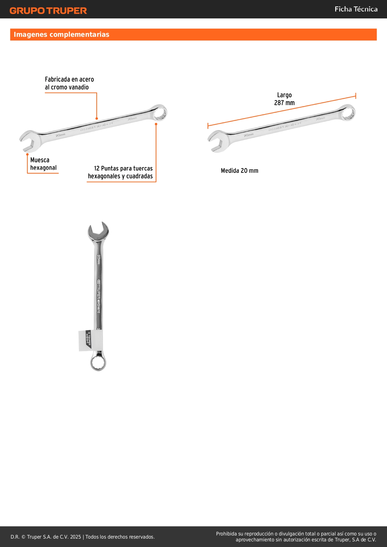 Llave mixta extralarga 20 mm x 287 mm de largo, expert truper