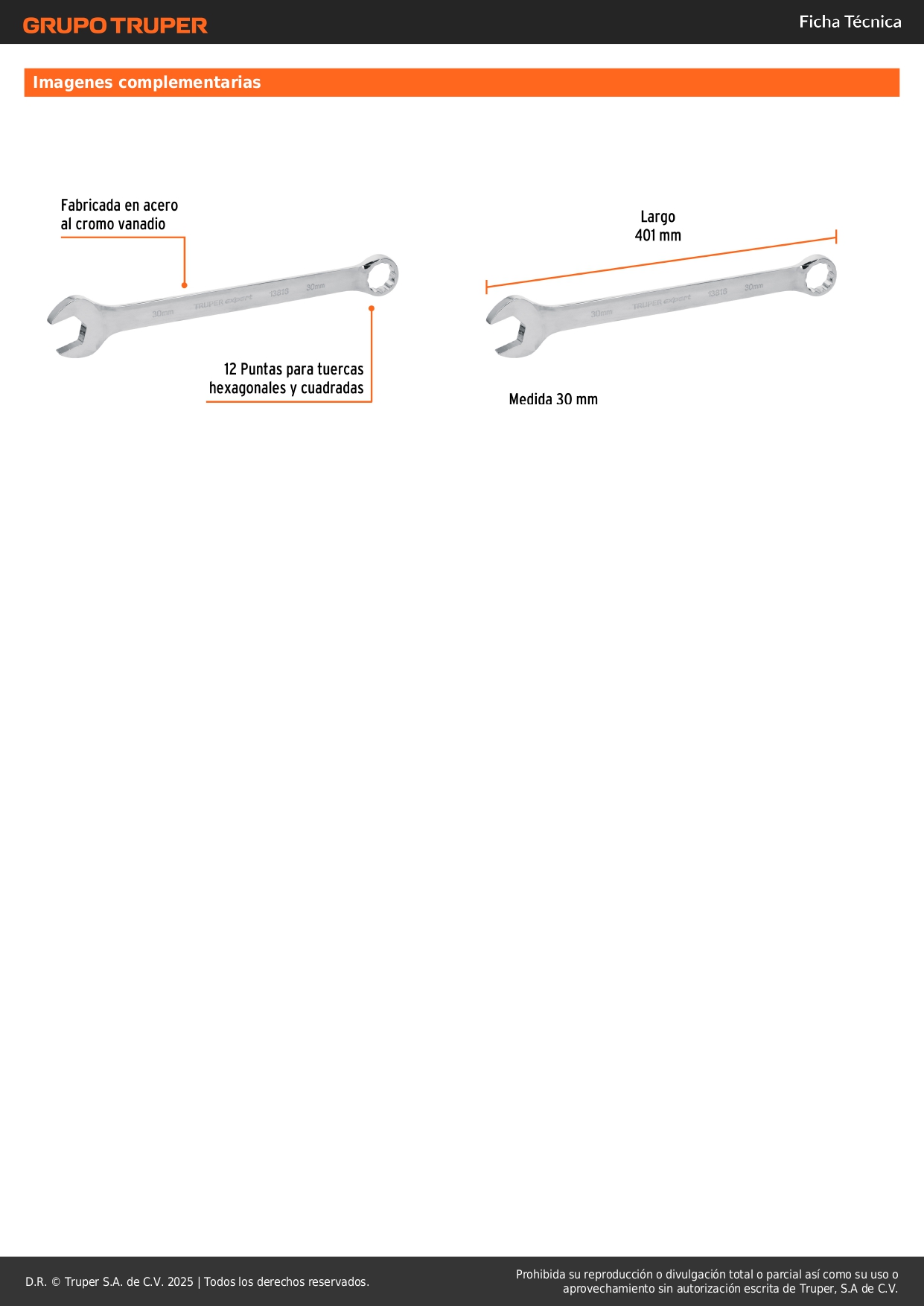 Llave mixta extralarga 30 mm x 390 mm de largo, expert truper