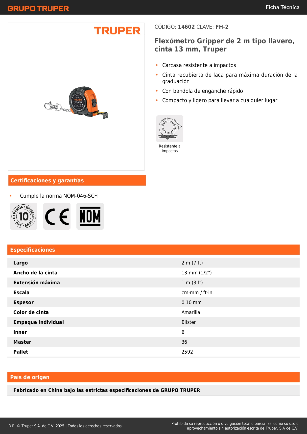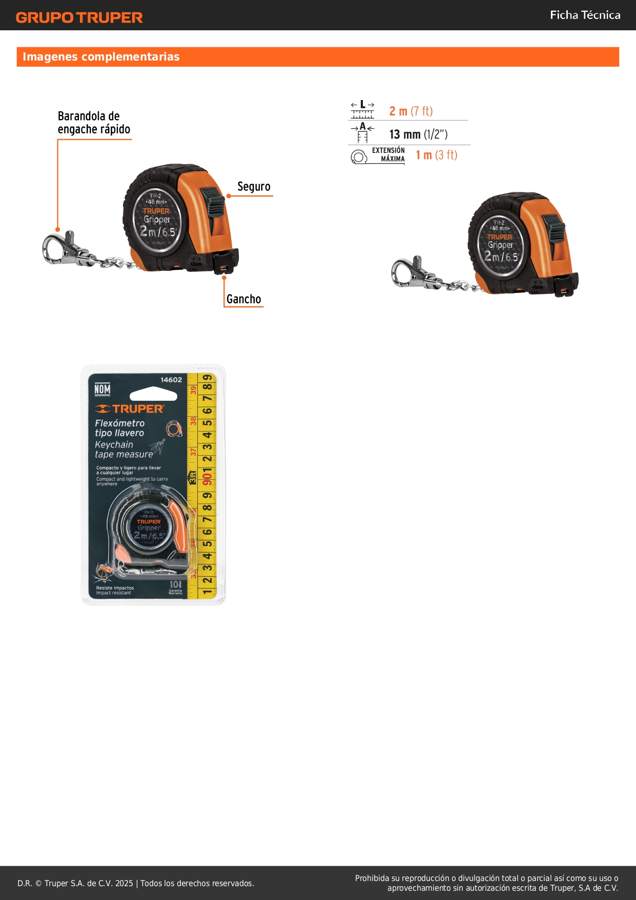 Flexómetro Gripper de 2 m tipo llavero, cinta 13 mm, Truper
