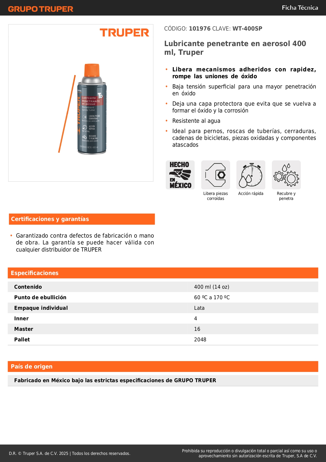 • Ideal para pernos, roscas de tuberías, cerraduras, cadenas de bicicletas, piezas oxidadas y componentes atascados