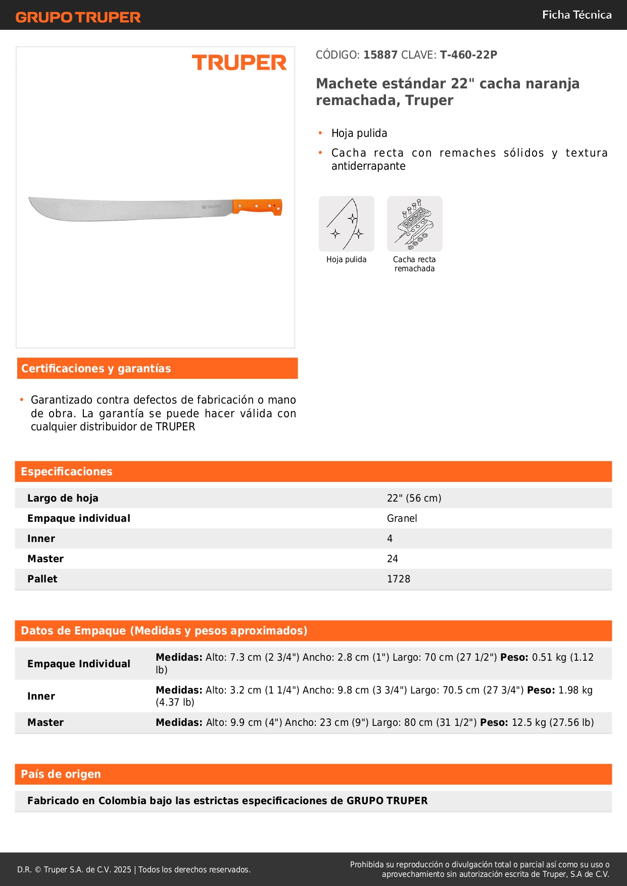 Machete estándar 22´´ cacha naranja remachada, truper S/ 16.00 Agregar al carro Avísame cuando llegue -Hoja pulida-Cacha recta con remaches sólidos y textura antiderrapante