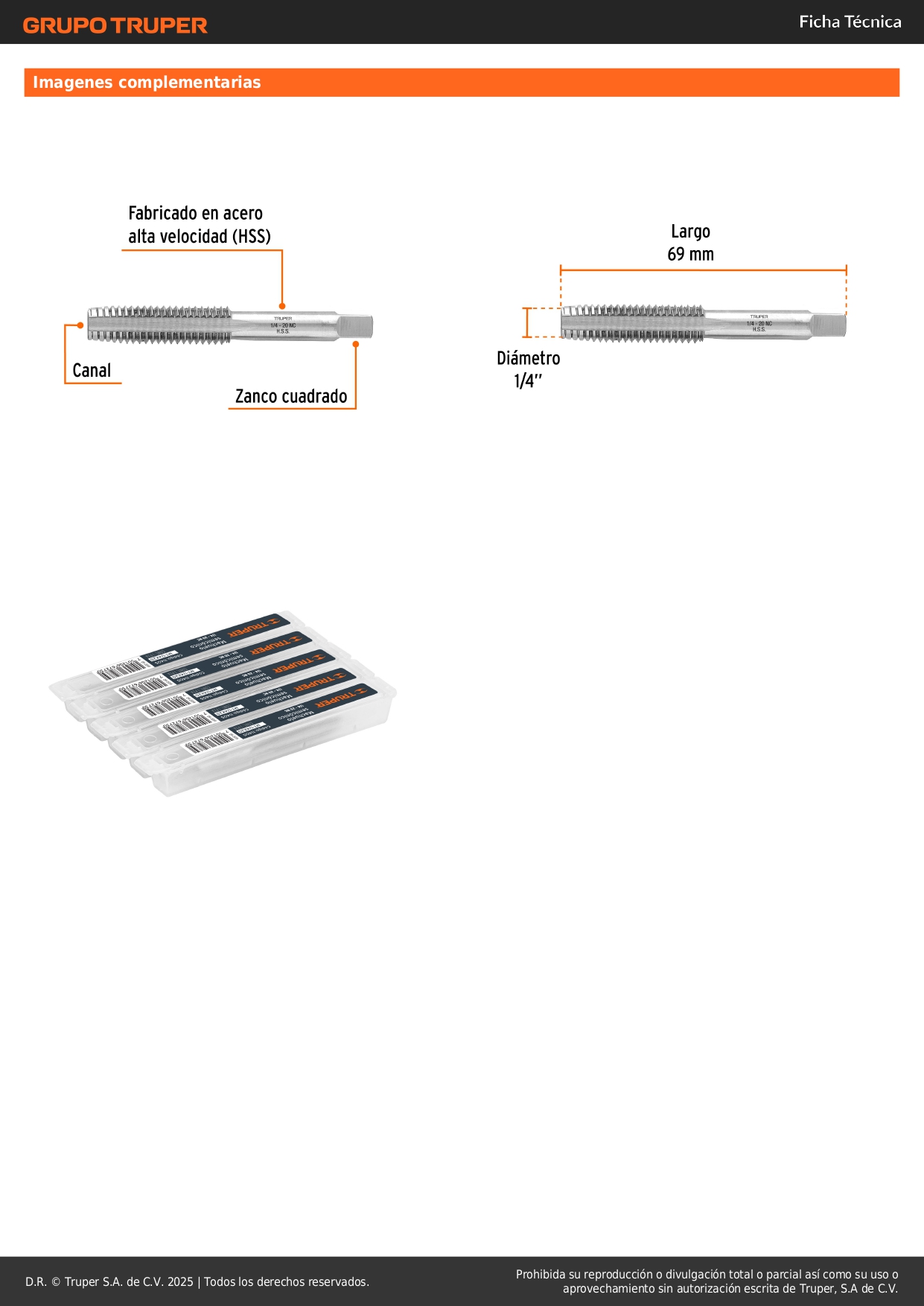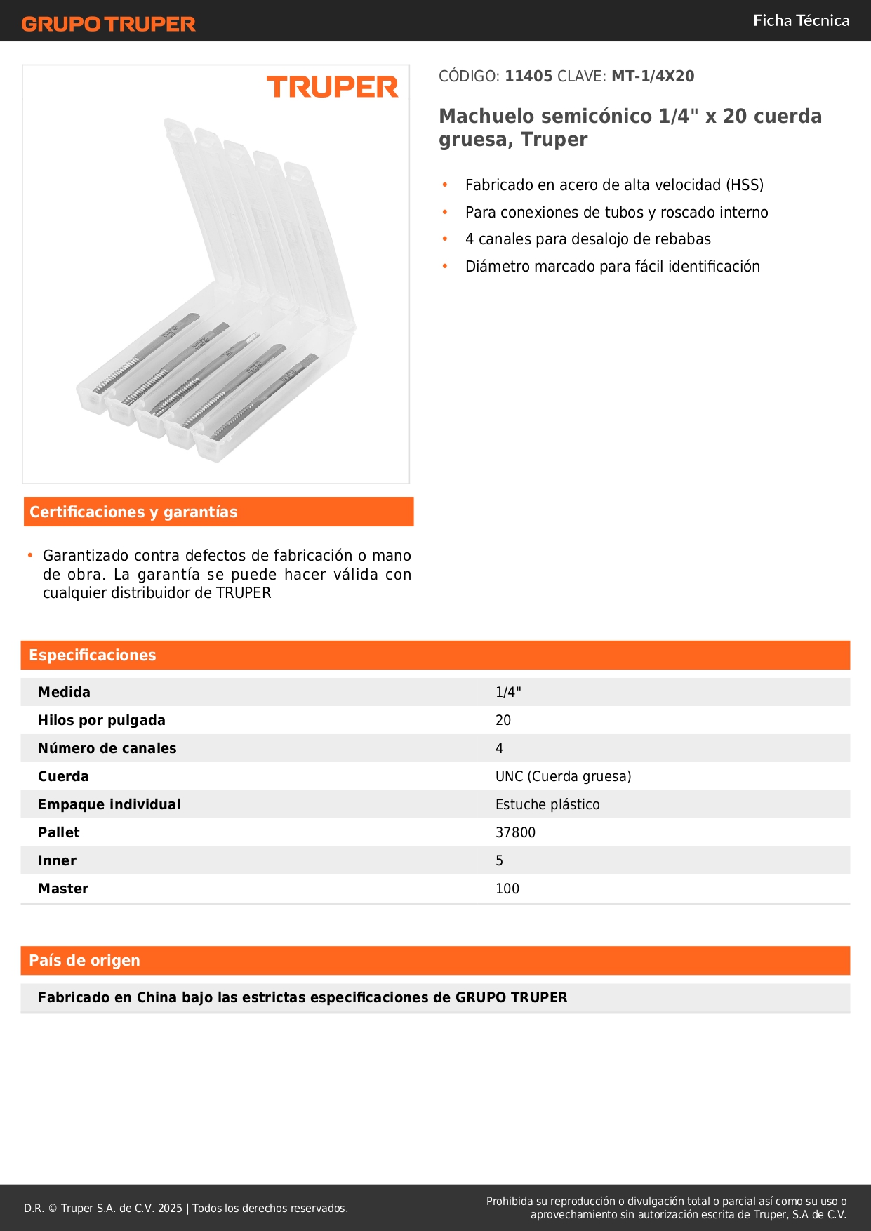 Macho semicónico 1/4´´ x 20 cuerda gruesa, truper S/ 8.90 Agregar al carro Avísame cuando llegue -Fabricado en acero de alta velocidad (HSS)-Para conexiones de tubos y roscado interno-4 canales para desalojo de rebabas-Diámetro marcado para fácil identificación