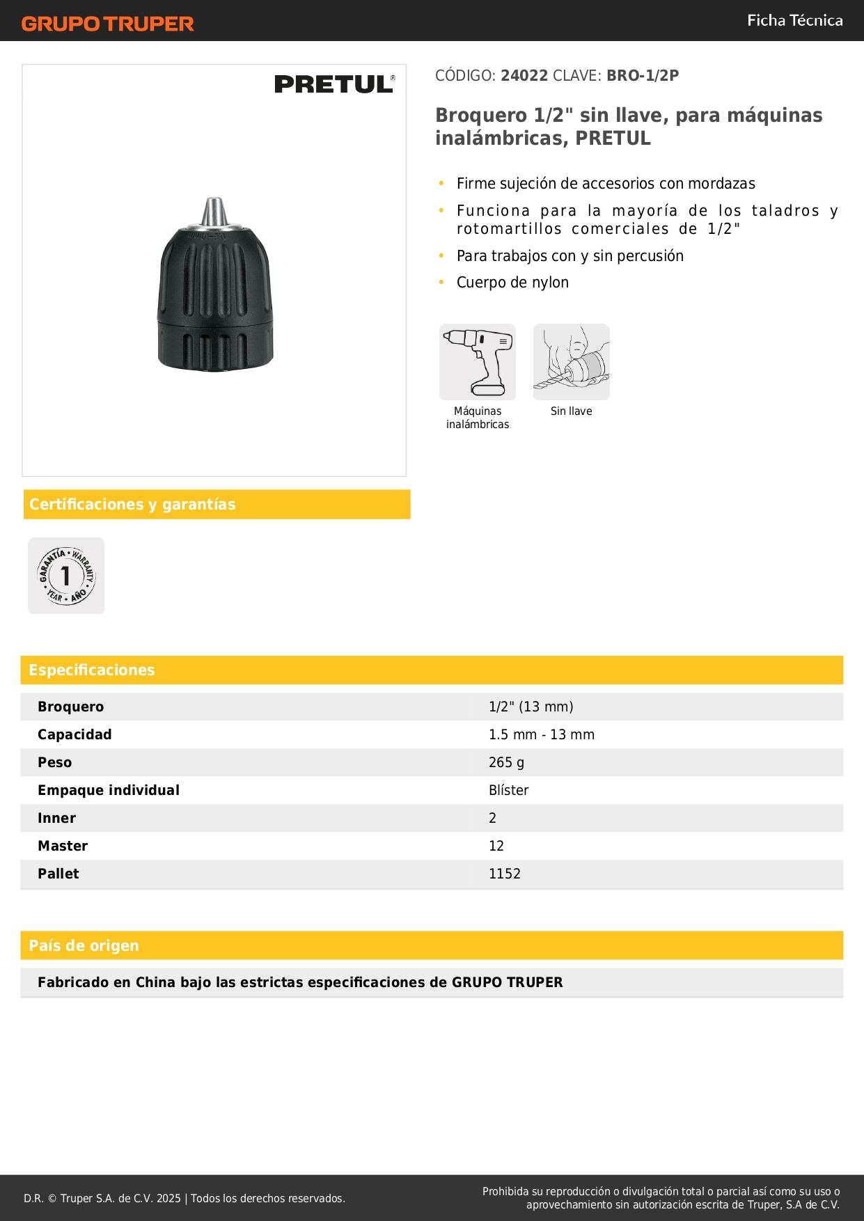 Mandril chuck broquero automático ½" sin llave para taladro pretul