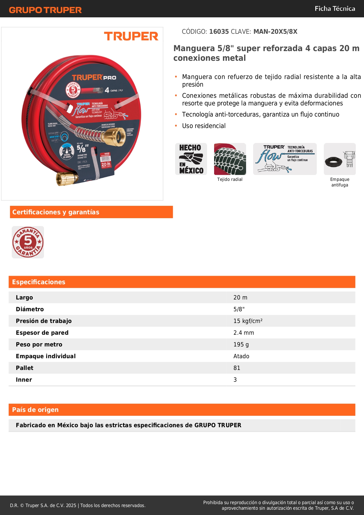 Manguera 5/8´´ super reforzada 4 capas 20 m conexiones metal truper
