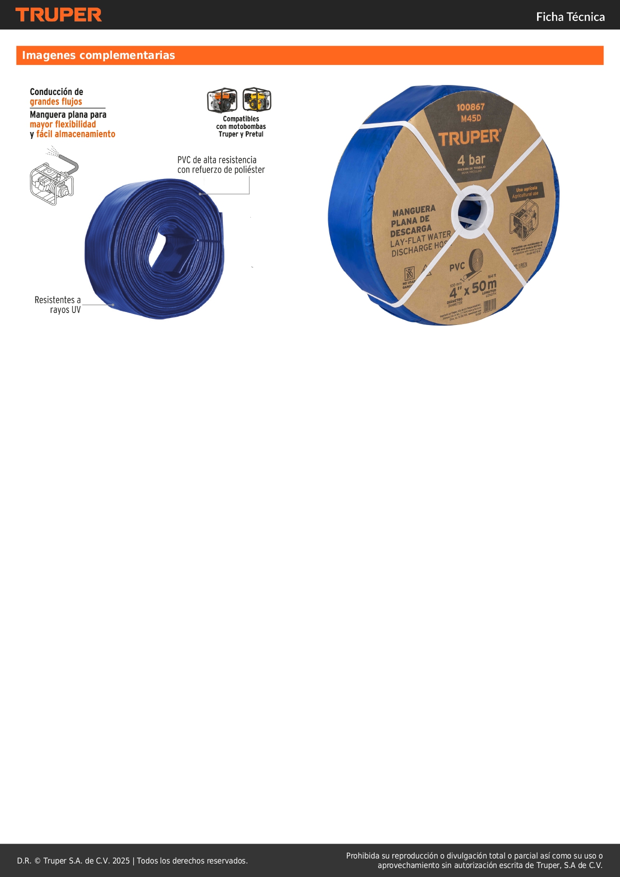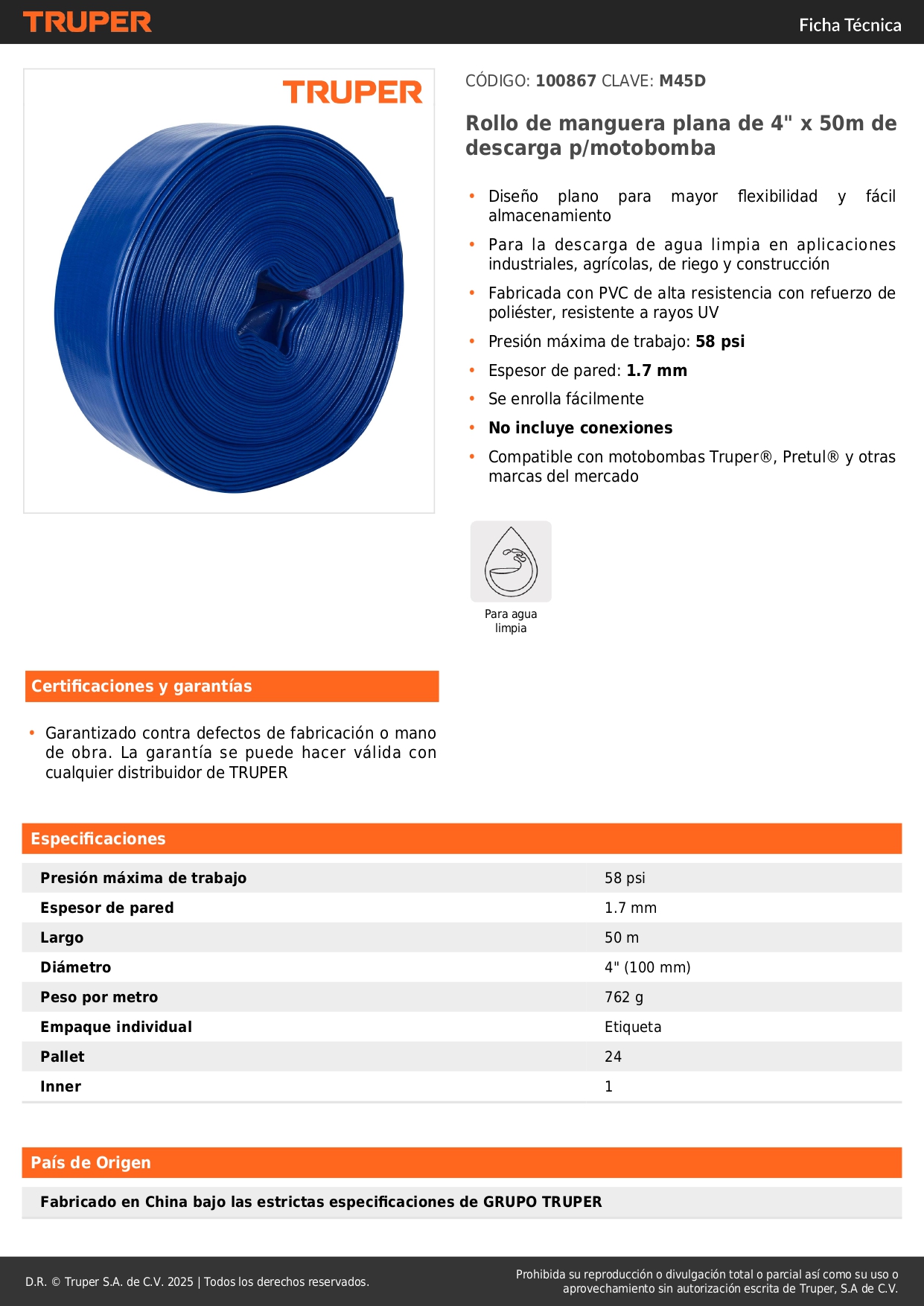 Manguera de uso agrícola de pvc plana, 4" x 50 m