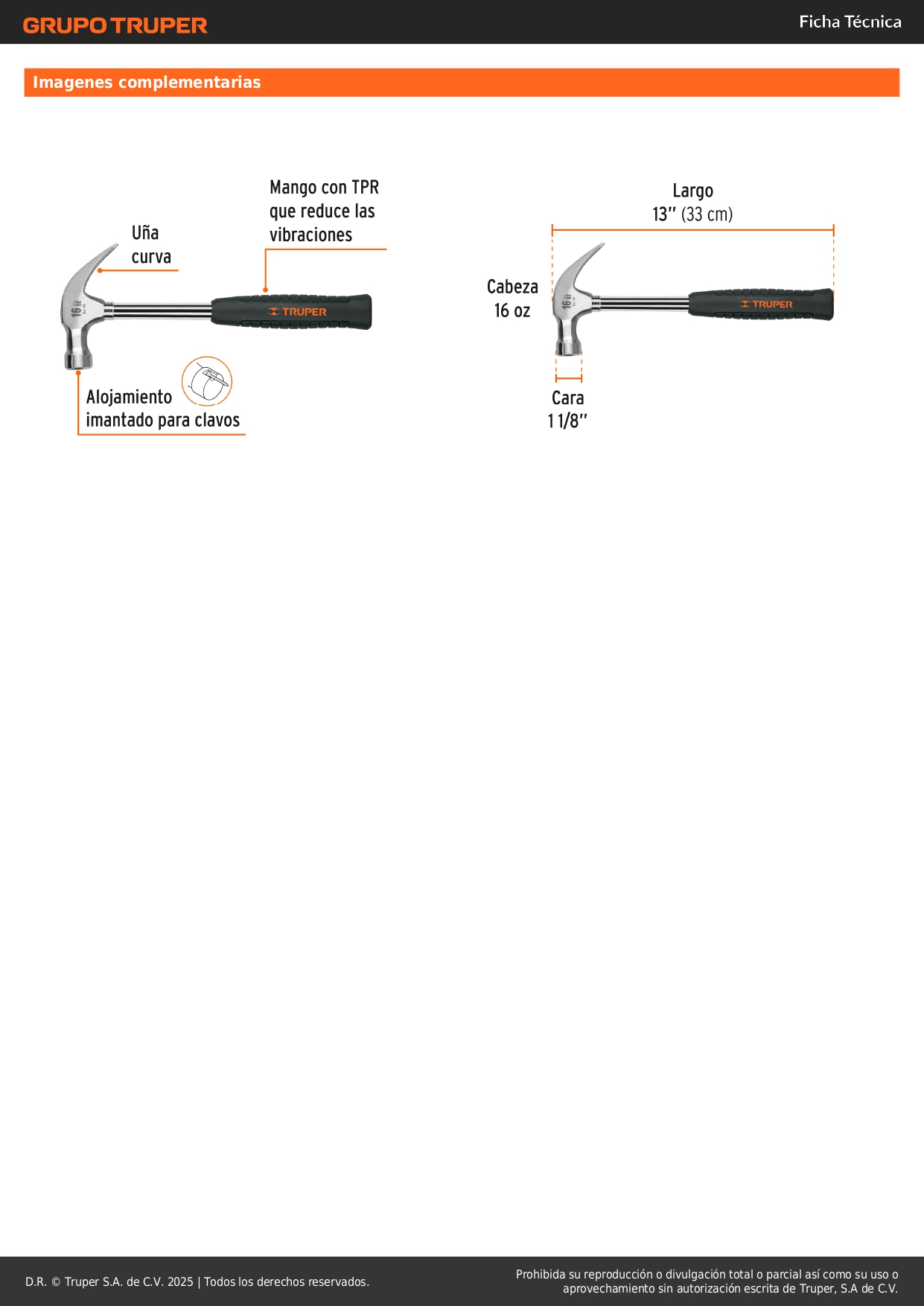 Martillo pulido 16 oz uña curva, mango tubular c/neopreno, truper S/ 28.90 Agregar al carro Avísame cuando llegue -Cabeza de acero con acabado pulido y alojamiento imantado para clavos-Mango de TPR que reduce las vibraciones del golpe-Ideal para clavar o extraer clavos