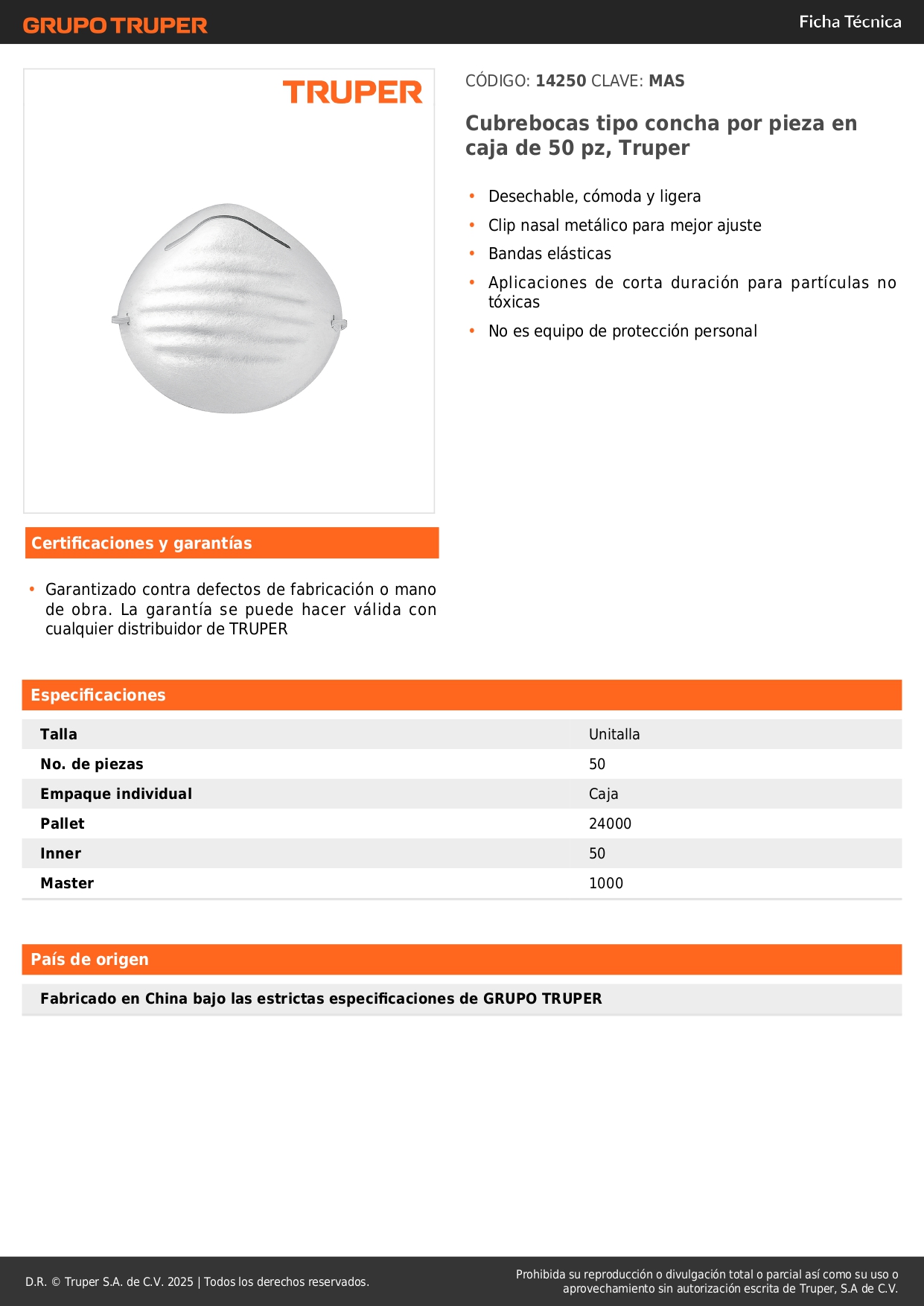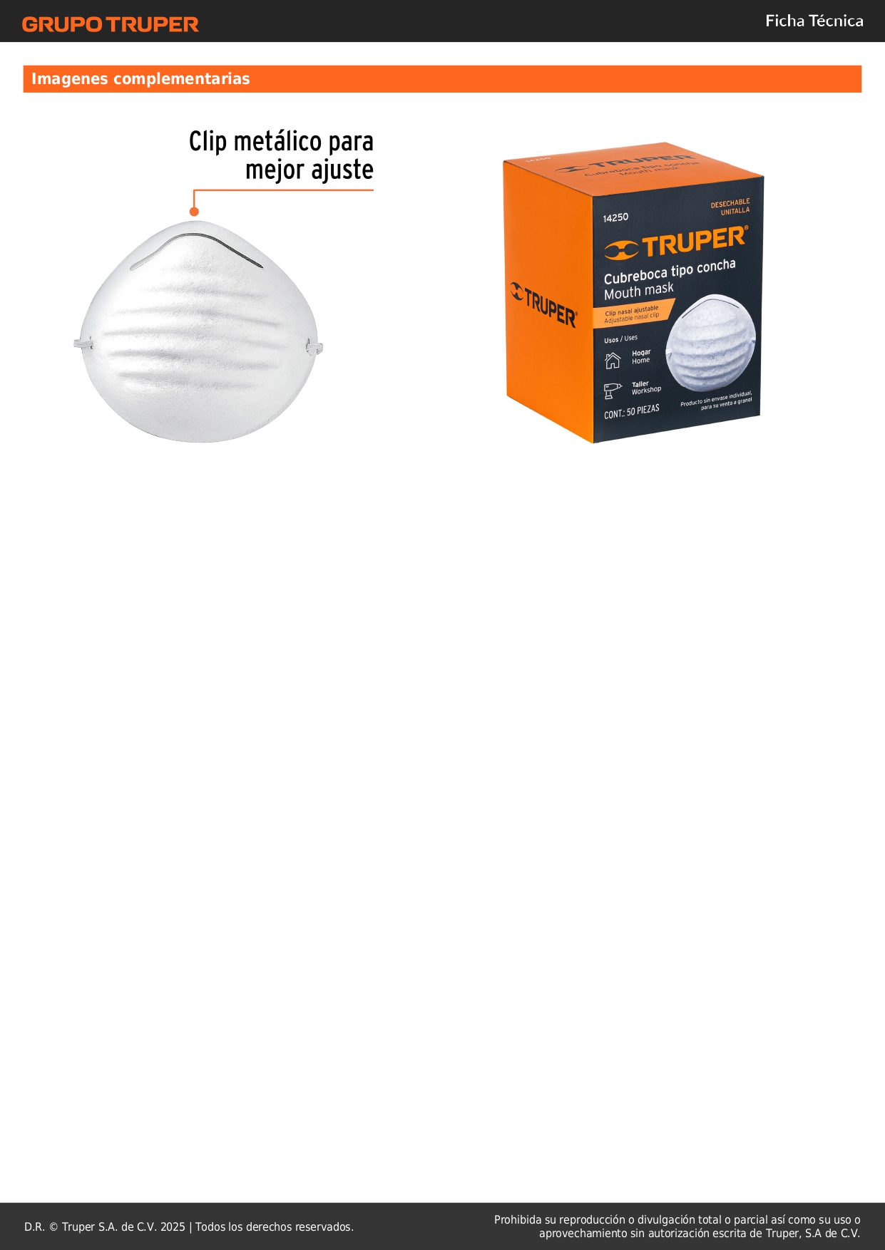 Mascarilla tipo concha por pieza en caja de 50 pz, truper S/ 30.90 Agregar al carro Avísame cuando llegue -Desechable, cómoda y ligera-Clip nasal metálico para mejor ajuste-Bandas elásticas-Aplicaciones de corta duración para partículas no tóxicas-No es equipo de protección personal