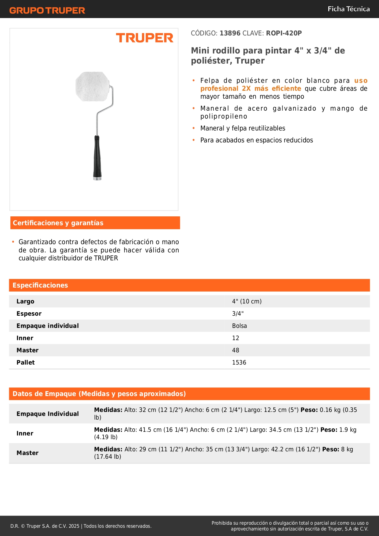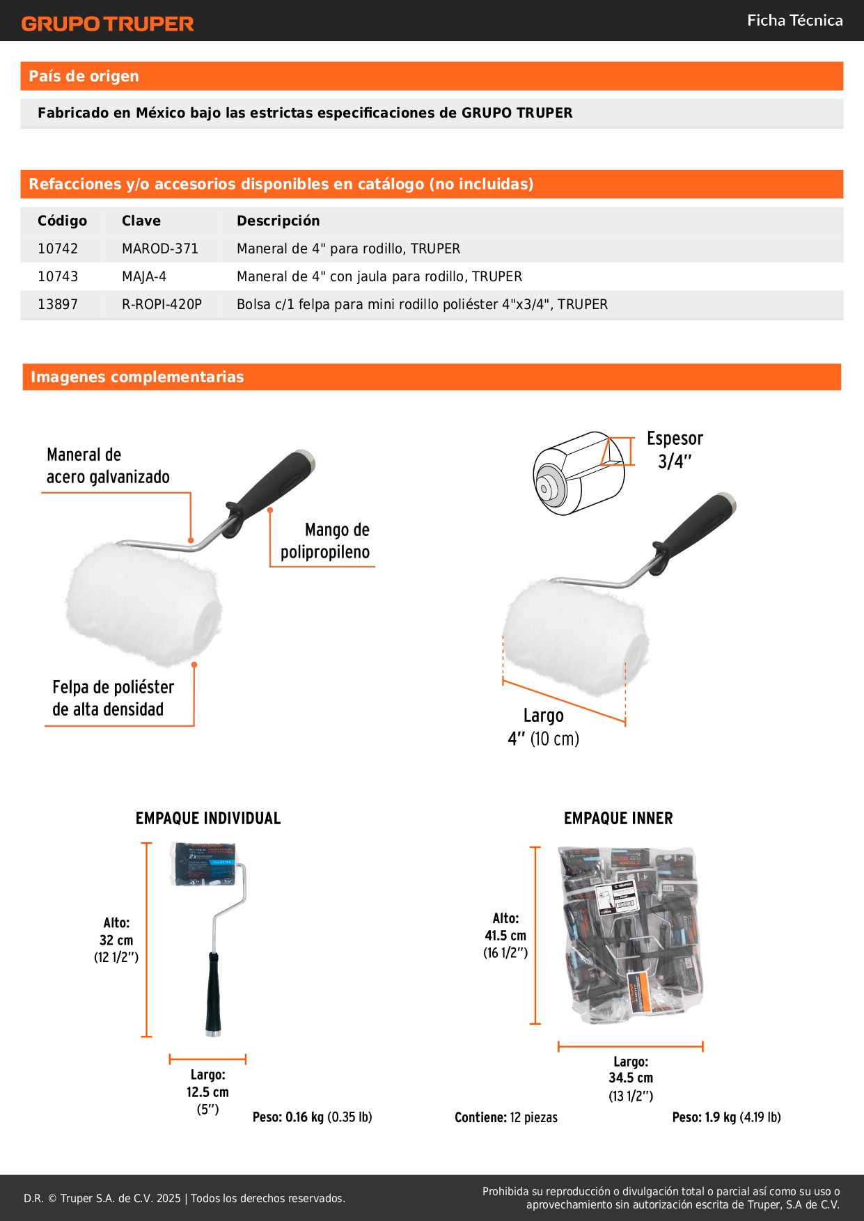 Mini rodillo para pintar 4´´ x 3/4´´ de poliéster, truper