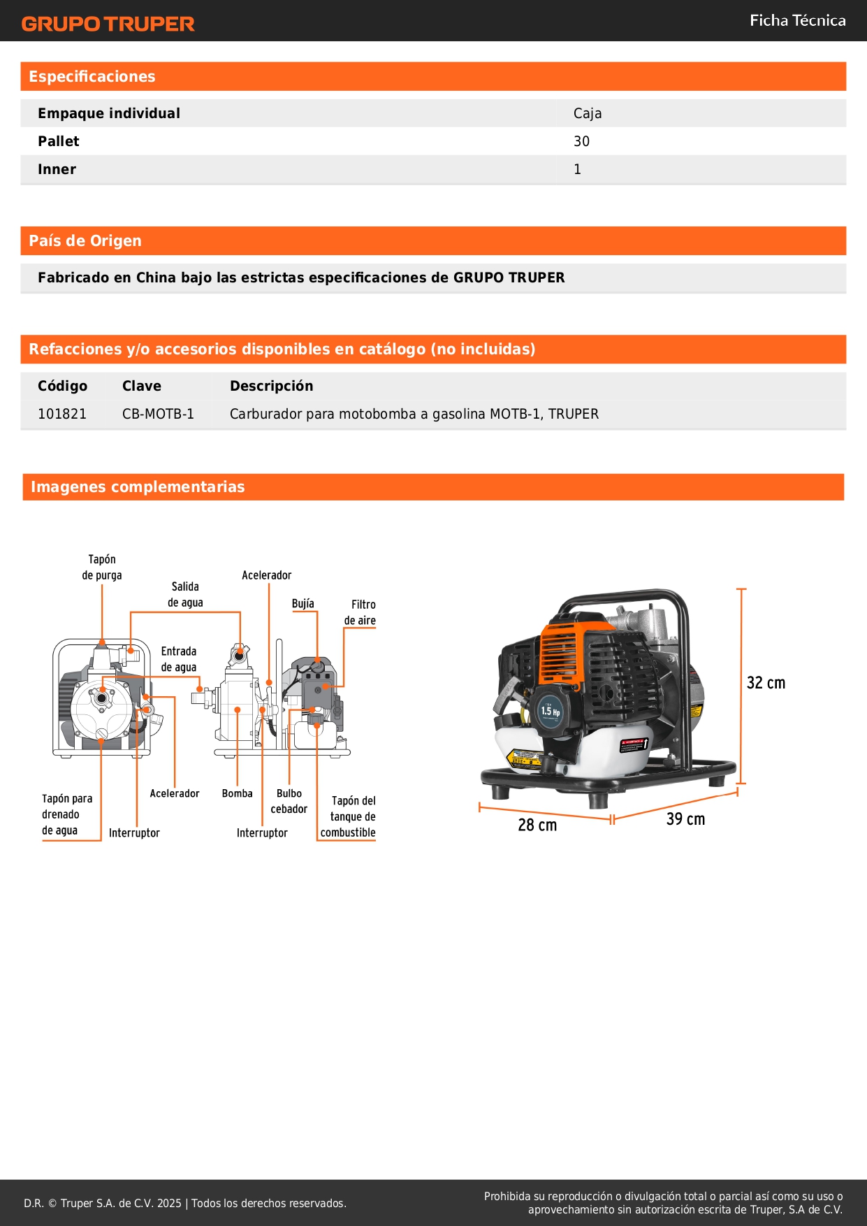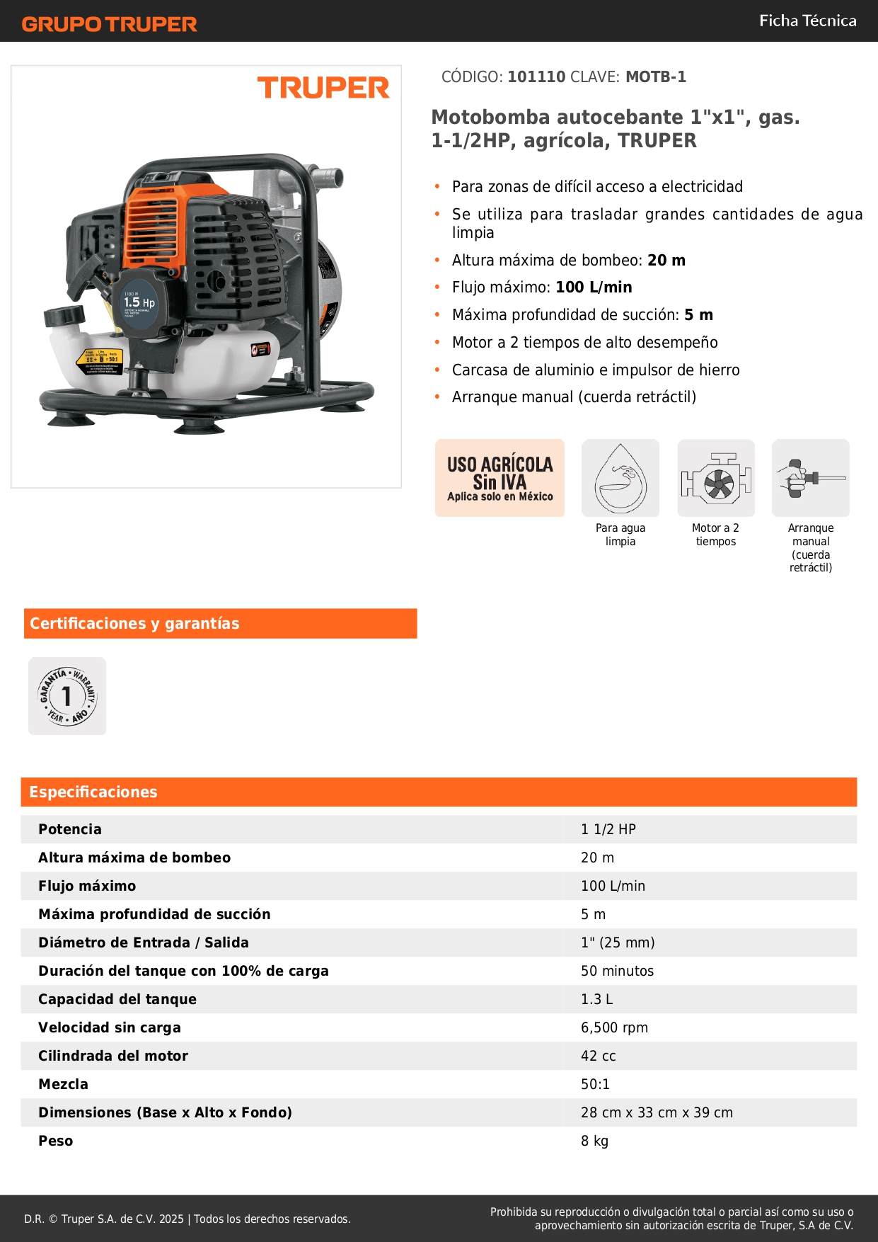Motobomba autocebante 1"x1", gas. 1-1/2HP, agrícola, TRUPER
