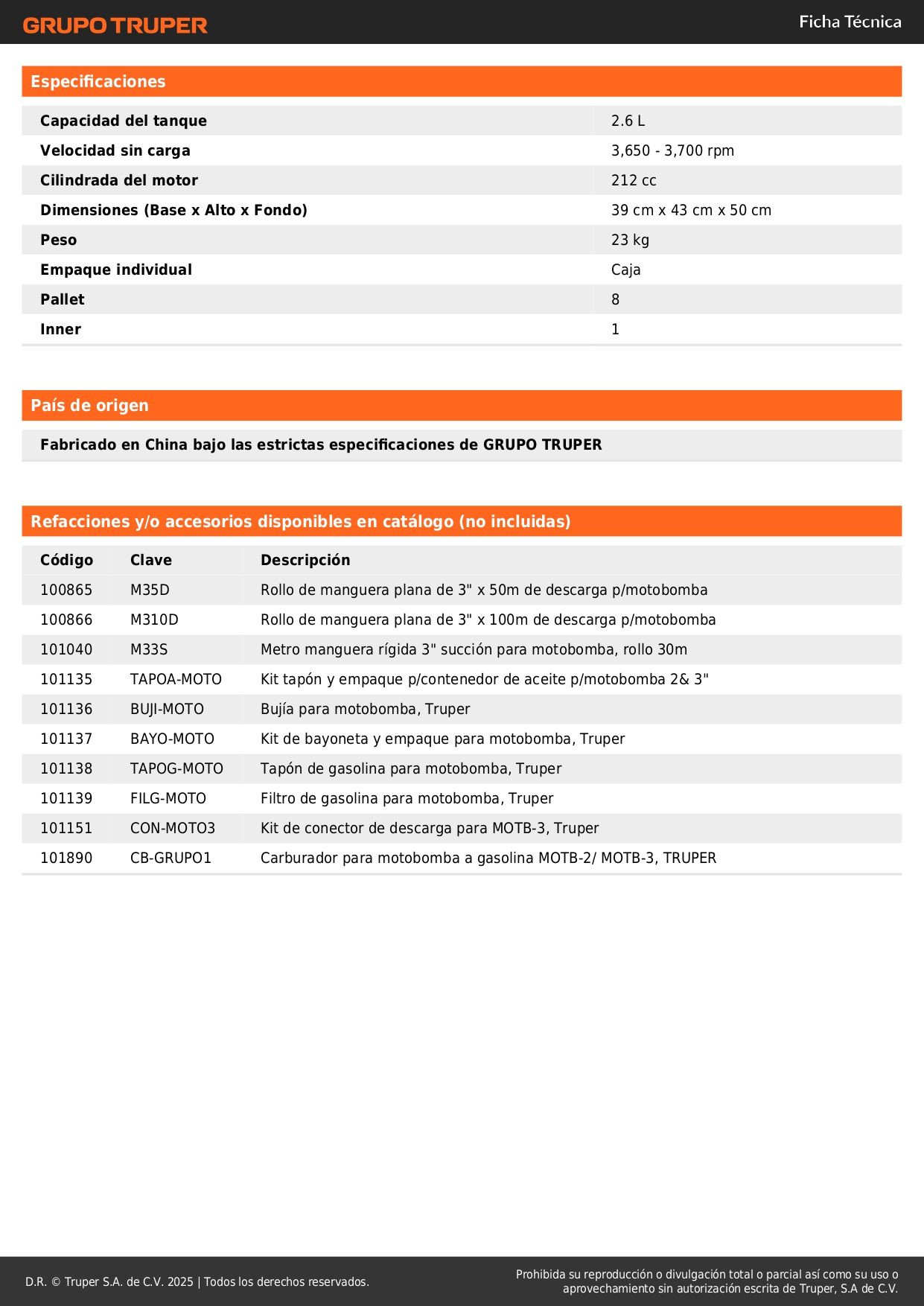• Compatible con mangueras para descarga modelos M35D, M310D y de succión, modelo M33S marca Truper®