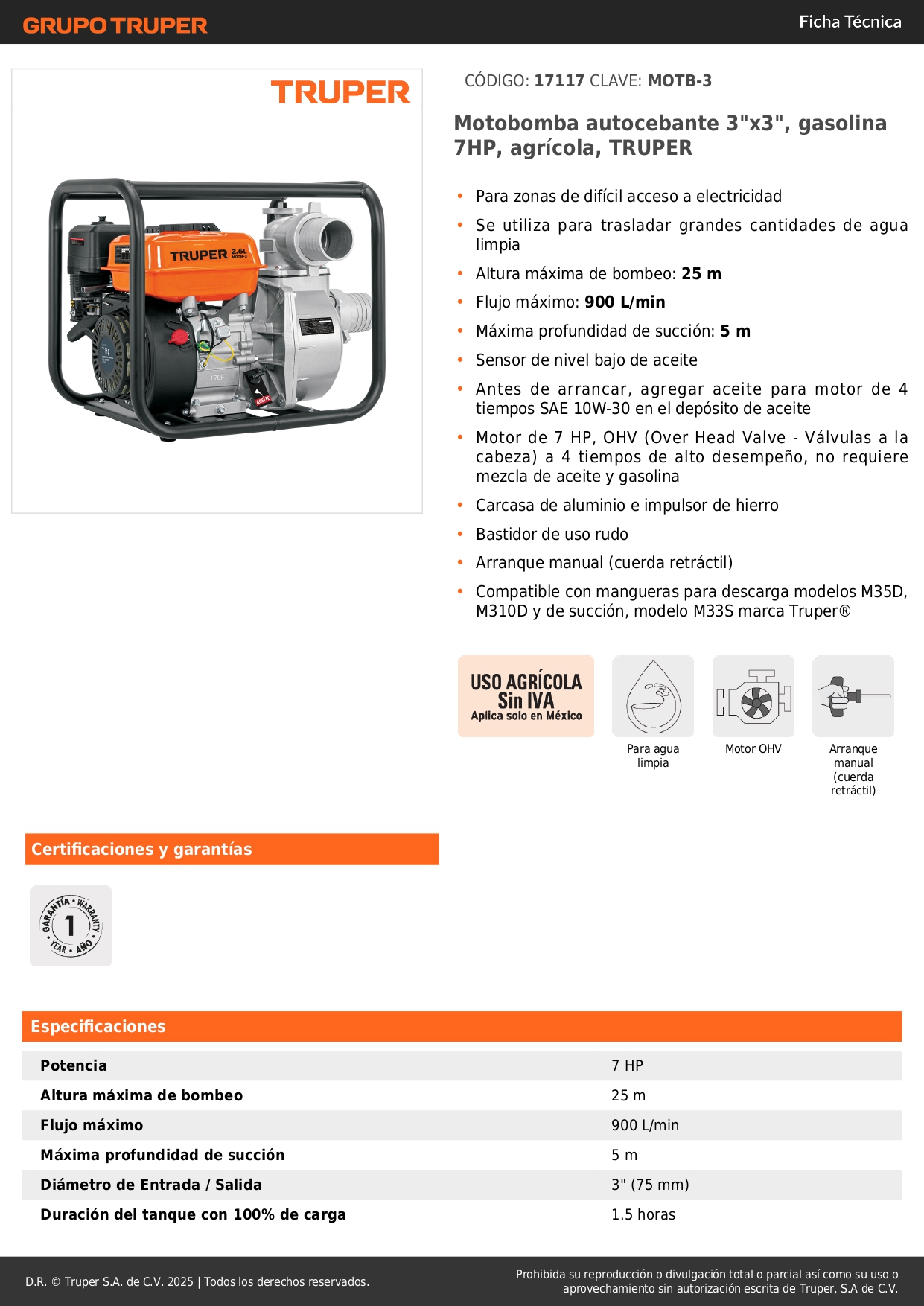 • Altura máxima de bombeo: 25 m