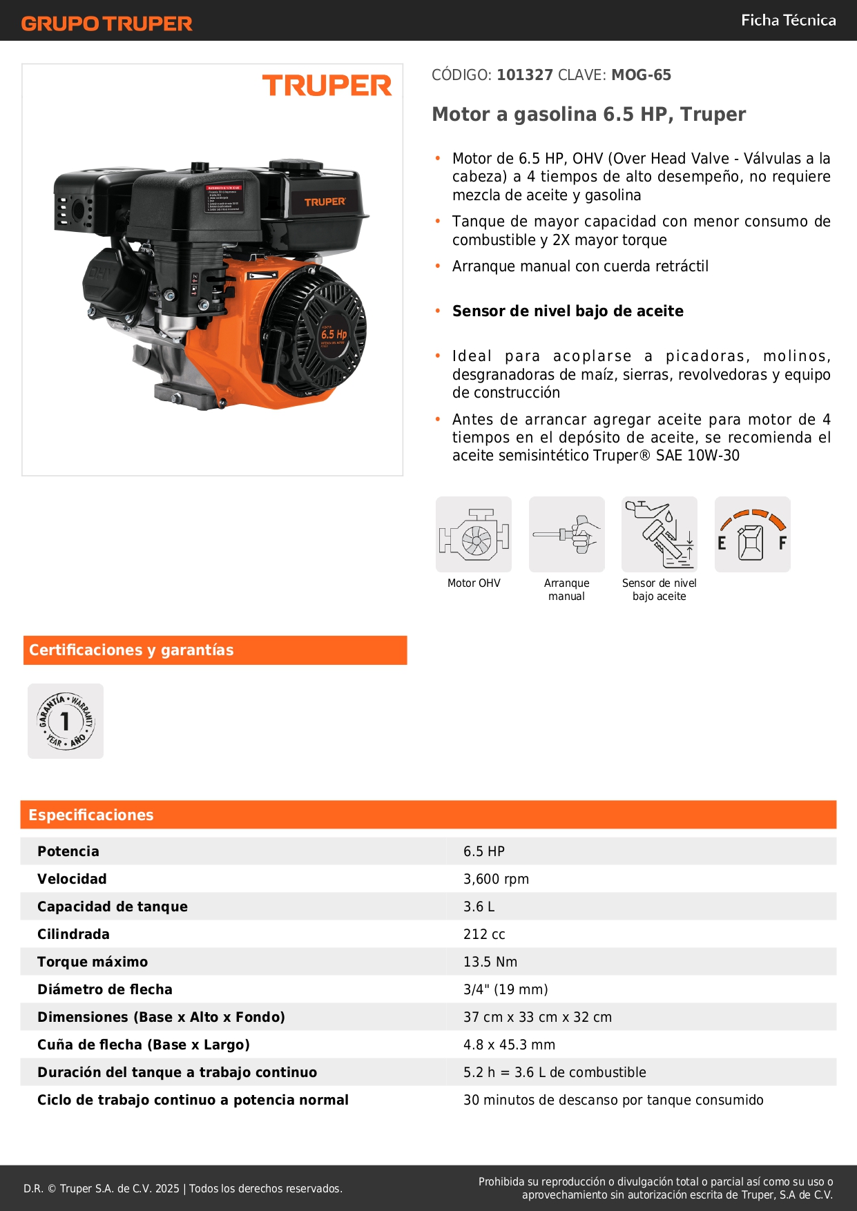 • Motor de 6.5 HP, OHV (Over Head Valve - Válvulas a la