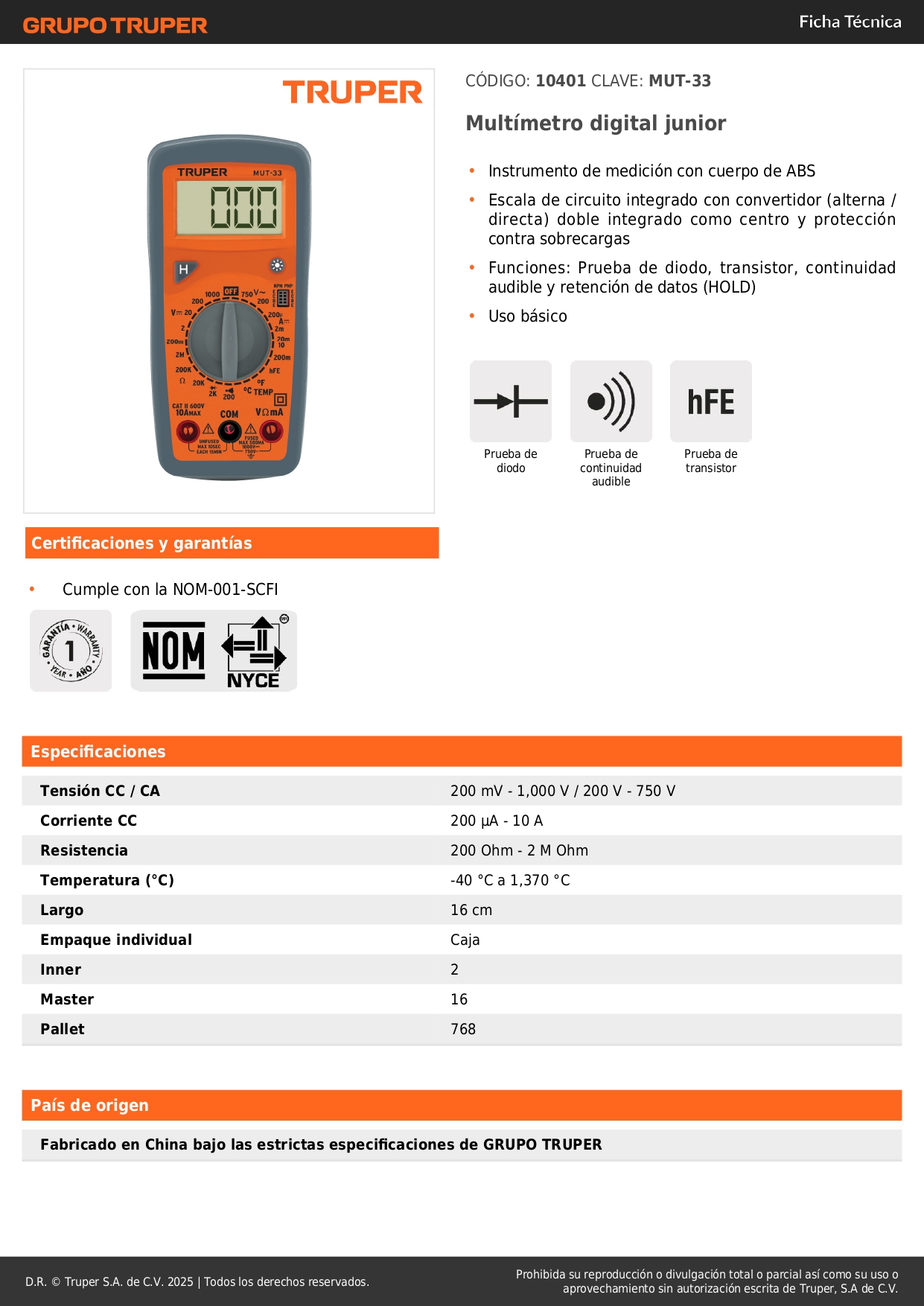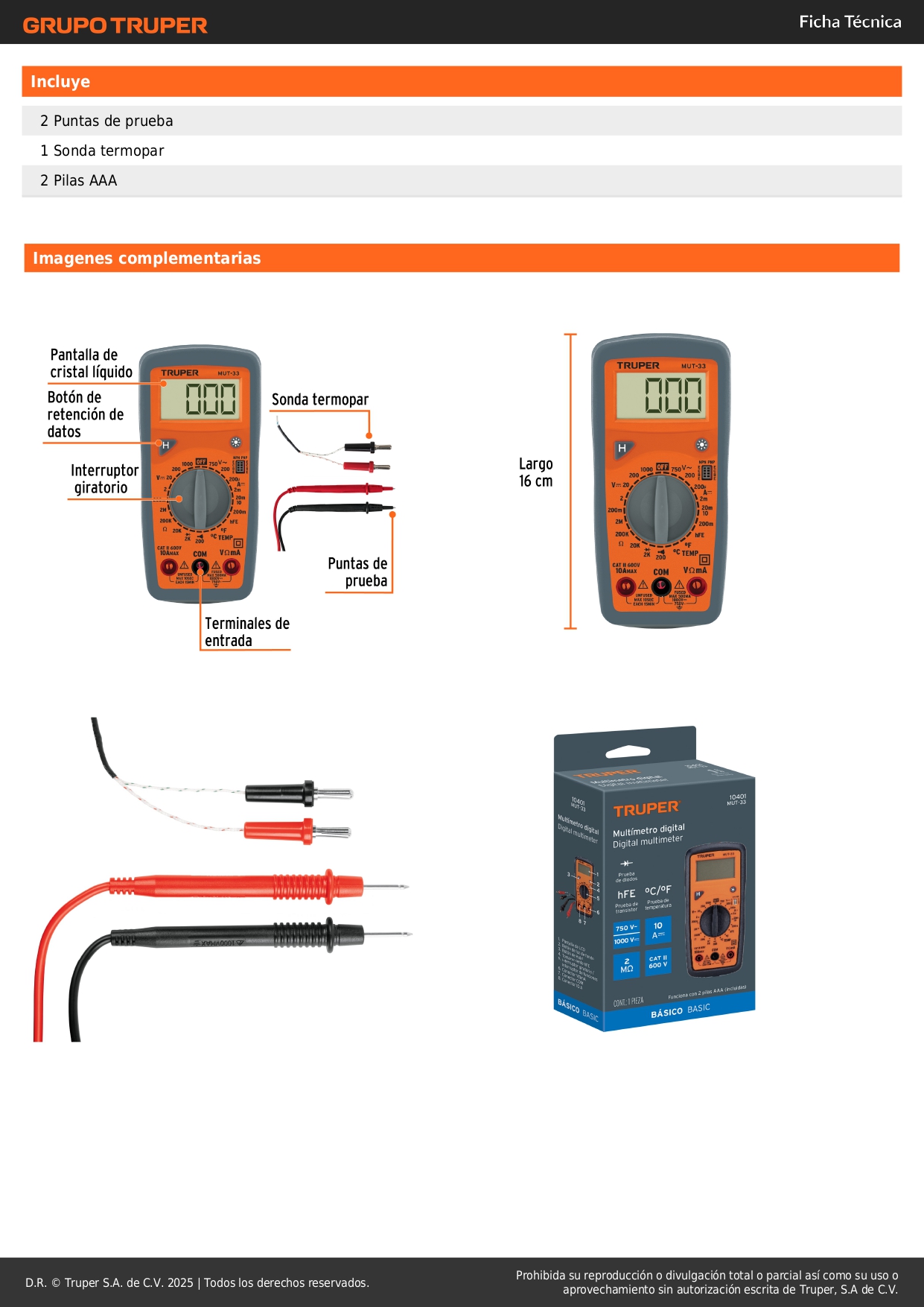 • Funciones: Prueba de diodo, transistor, continuidad audible y retención de datos (HOLD)
