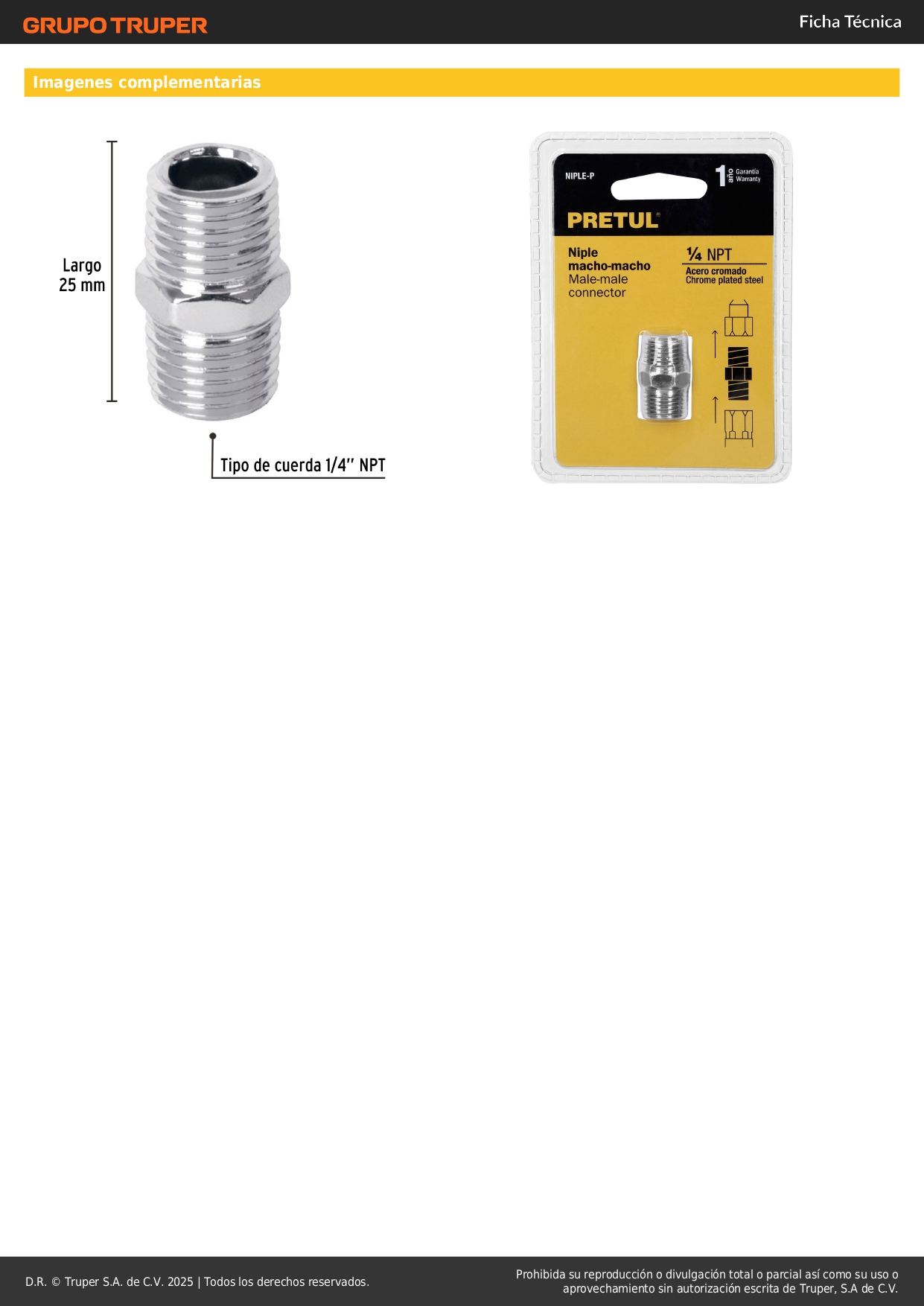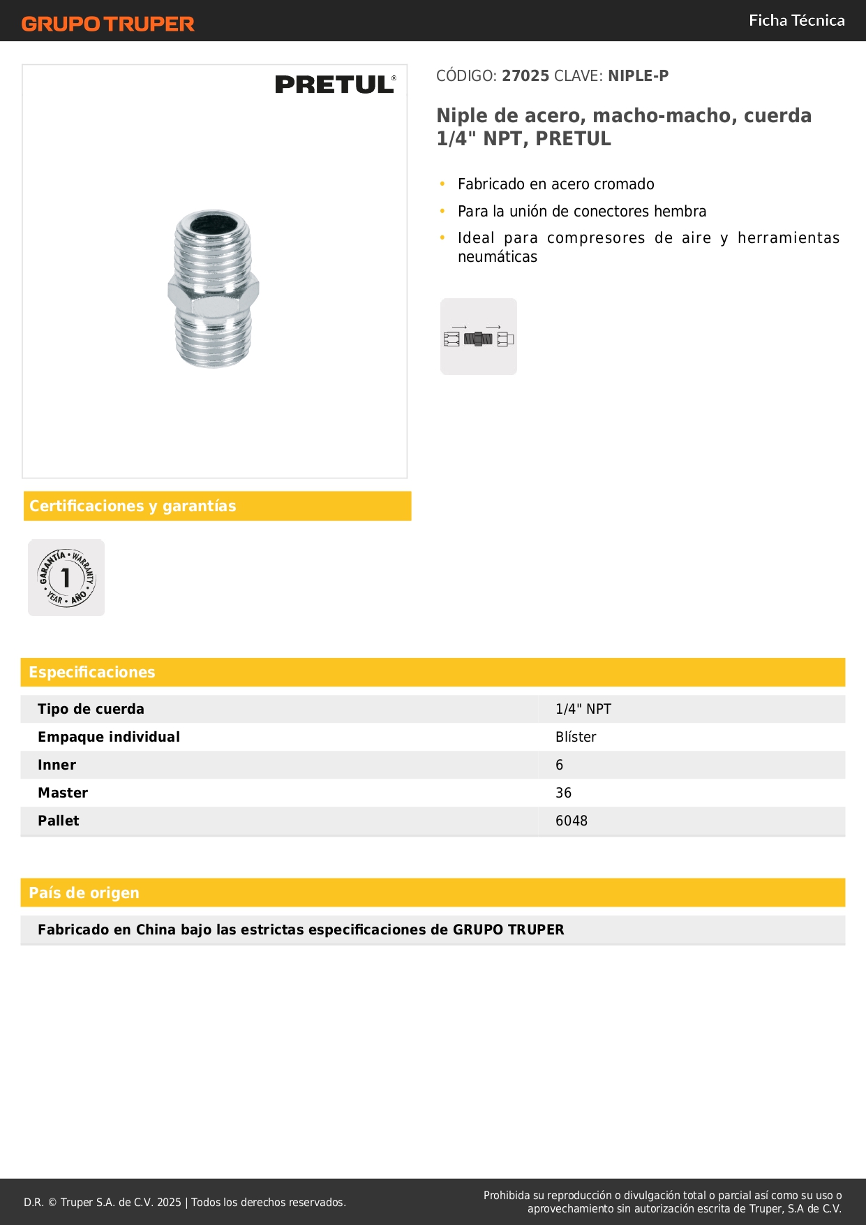 Niple acero, cuerda 1/4 npt, pretul S/ 3.20 Agregar al carro Avísame cuando llegue -Fabricado en acero cromado-Para la unión de conectores hembra-Ideal para compresores de aire y herramientas neumáticas