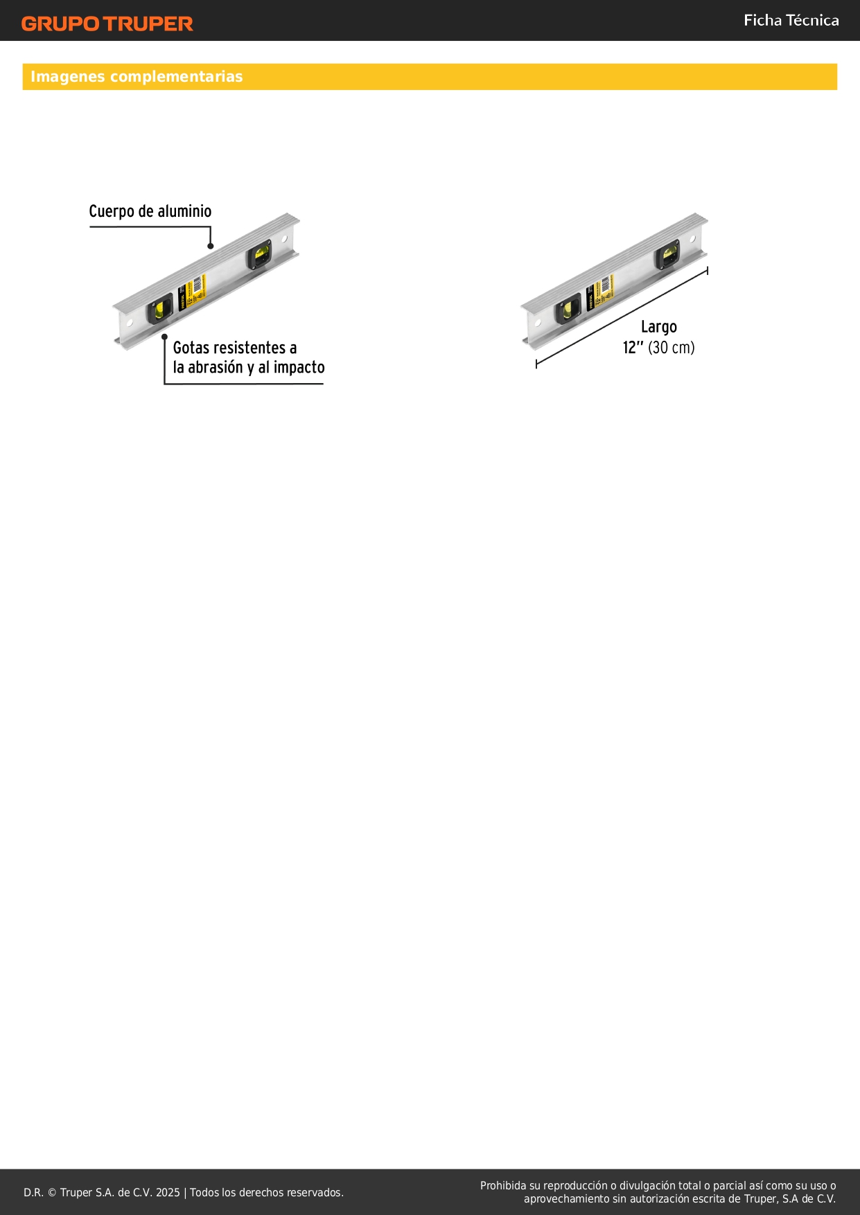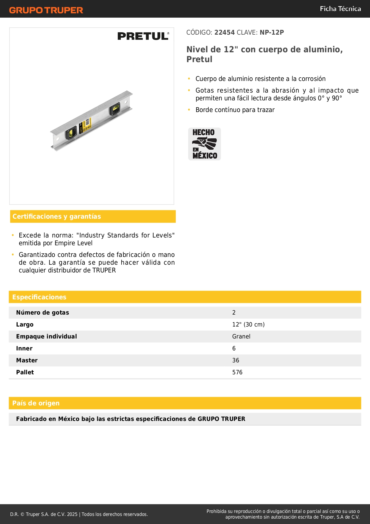 Nivel de 12" con cuerpo de aluminio, Pretul