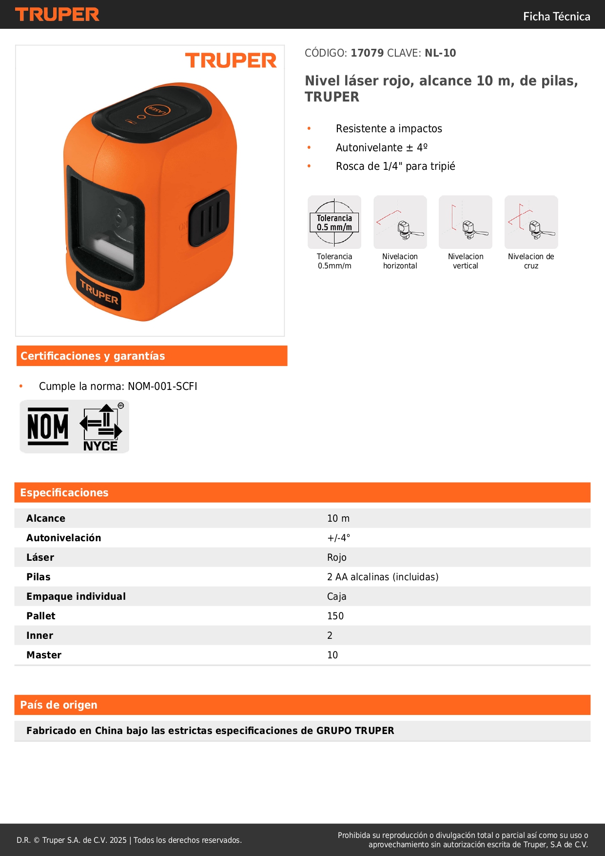 Nivel laser 10 metros truper S/ 198.00 Agregar al carro Avísame cuando llegue -Resistente a impactos-Autonivelante ± 4º-Rosca de 1/4" para tripié