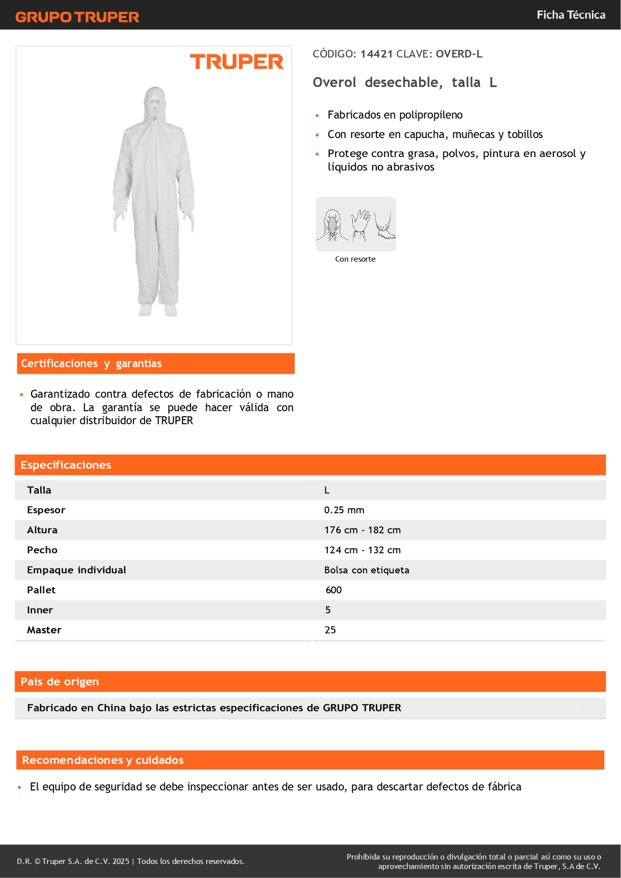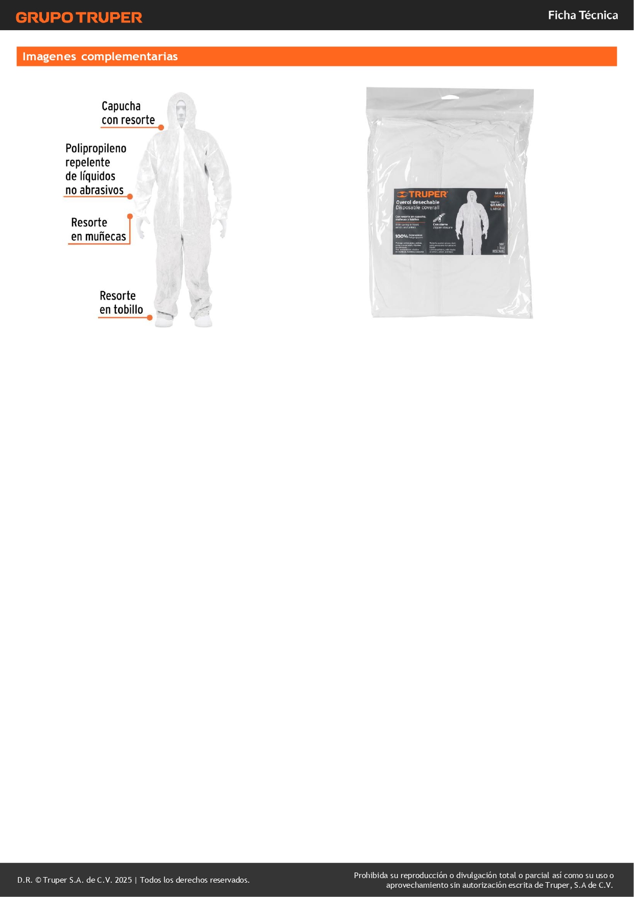 Overol desechable, talla l truper S/ 21.80 Agregar al carro Avísame cuando llegue -Fabricados en polipropileno -Con resorte en capucha, muñecas y tobillos-Protege contra grasa, polvos, pintura en aerosol y líquidos no abrasivos